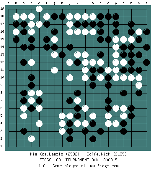 Last move : 1-0 2009 June 18 17:45:24 [Event "FICGS__GO__TOURNAMENT_DAN__000015"] [Site "FICGS"] [Date "2009.01.10"] [Round "1"] [Black "Kis-Kos,Laszlo"] [White "Ioffe,Nick"] [Result "1-0"] [Rating 1 "2532"] [Rating 2 "2135"] 1.r16 d16 2.q3 e4 3.p17 q5 4.q8 o4 5.p5 p4 6.q4 p6 7.r5 q6 8.r6 c5 9.f17 g15 10.f15 g13 11.f14 g11 12.d14 c15 13.c14 d18 14.d10 p15 15.q14 o17 16.p16 o16 17.o15 p14 18.n15 m16 19.n13 p13 20.n16 n17 21.m17 m18 22.l17 l18 23.k17 k18 24.p18 j17 25.n18 k16 26.o18 l16 27.n17 j16 28.h18 j18 29.o6 o5 30.o7 k4 31.n11 p11 32.o9 r13 33.r14 r10 34.s8 s9 35.s11 s14 36.q13 q12 37.s13 r15 38.r12 q15 39.r13 s16 40.r17 s10 41.t14 t15 42.s15 d12 43.c12 s14 44.q11 p12 45.s15 n10 46.o10 s14 47.r11 t13 48.t12 q10 49.t14 p10 50.s15 o11 51.t16 n12 52.m11 m12 53.g14 l11 54.m10 l10 55.m9 l13 56.k12 l12 57.j14 k13 58.h13 j12 59.c3 d2 60.c7 d7 61.d6 c6 62.e7 d8 63.c8 e6 64.d9 e8 65.c17 d17 66.b15 b16 67.c16 c18 68.b17 b18 69.d15 f18 70.g18 e17 71.g16 e19 72.k6 h4 73.m4 m3 74.l3 l4 75.n3 m5 76.m2 l6 77.j3 h3 78.k8 j10 79.j4 j5 80.j2 h5 81.k5 k7 82.j7 1-0 Here are the names of the openings (joseki) played in the four corners : Corner q4 : q3 q5 Komoku (Somok, Xiao~mu`) 3-4 Point. The komoku (3-4) point is the traditional corner enclosure move.. Ikken Takagakari (Hankan Nop'dakeolch'im, Yi Gaogua`jiao~, 1-Space High Approach). The 5-4 approach move has become more popular in modern times, as modern Go emphasizes speed and influence. Corner d16 : d16 f17 Hoshi (Hwajeom, Seongjeom, Xingwei`) 4-4 Point. The star or hoshi (4-4) point, emphasizing influence at the potential expense of territory. Ikken Kakari (Hankan Keolch'im, Yi Gua`jiao~, 1-Space Low Approach). Black 2 is the standard approach move to the 4-4. Player Black won this Go (weiqi, baduk) game. Follow this game move after move (download)The L-group is dead. (Anonymous) God, you are such an idiot. - Actually, I thought I was more of a jerk. (Gregory House to Stacy Warner, House M.D.)