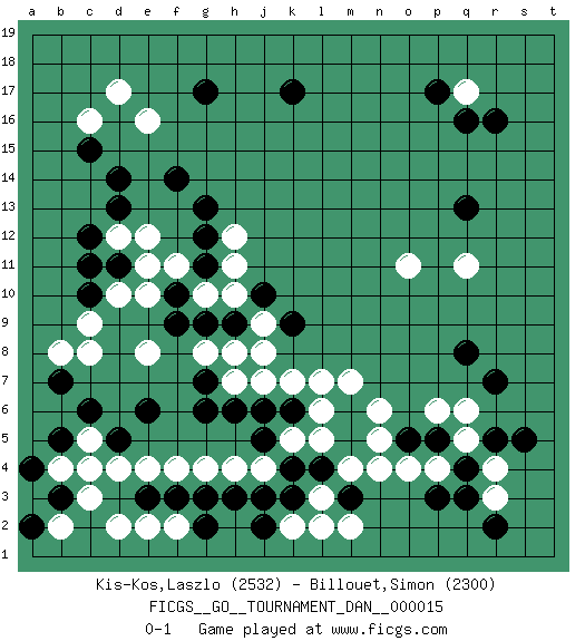 Last move : 0-1 2009 May 7 11:54:30 [Event "FICGS__GO__TOURNAMENT_DAN__000015"] [Site "FICGS"] [Date "2009.01.10"] [Round "1"] [Black "Kis-Kos,Laszlo"] [White "Billouet,Simon"] [Result "0-1"] [Rating 1 "2532"] [Rating 2 "2300"] 1.r16 d17 2.q3 d4 3.p17 q5 4.q8 n4 5.p5 p6 6.o5 r3 7.q4 r4 8.r5 q6 9.s5 p4 10.p3 o4 11.r2 n6 12.c15 d12 13.g17 e16 14.k17 c16 15.c6 c8 16.e6 f4 17.g6 h4 18.c10 e8 19.c12 e10 20.d11 e11 21.d13 e12 22.d14 c9 23.f14 q11 24.q13 o11 25.r7 h7 26.h6 j7 27.c4 c3 28.d5 e4 29.b3 b4 30.b5 c5 31.j6 k7 32.c4 q17 33.q16 c5 34.g7 c4 35.g9 d10 36.c11 h8 37.f9 h11 38.k6 l7 39.m5 n5 40.k4 l3 41.k3 l2 42.b7 b8 43.j10 h10 44.h9 j9 45.k9 j8 46.m6 m7 47.g3 g4 48.l4 m4 49.h3 k2 50.j2 j4 51.j3 f2 52.f3 e2 53.g2 l6 54.e3 d2 55.a4 b2 56.a2 a3 57.m3 m2 58.b3 k5 59.j5 l5 60.g11 g10 61.f10 f11 62.g12 h12 63.g13 g8 0-1 Here are the names of the openings (joseki) played in the four corners : Corner q4 : q3 q5 Komoku (Somok, Xiao~mu`) 3-4 Point. The komoku (3-4) point is the traditional corner enclosure move.. Ikken Takagakari (Hankan Nop'dakeolch'im, Yi Gaogua`jiao~, 1-Space High Approach). The 5-4 approach move has become more popular in modern times, as modern Go emphasizes speed and influence. Corner d16 : d17 c15 Komoku (Somok, Xiao~mu`) 3-4 Point. The komoku (3-4) point is the traditional corner enclosure move.. Ikken Kakari (Hankan Keolch'im, Yi Gua`jiao~, 1-Space Low Pincer). The small knight move is the basic approach move to the 3-4 point stone. It has been continually used for over four centuries. There are limitless variations, with new moves constantly being discovered. Black 2 opens the door to a treaure store of joseki. Corner d4 : d4 c6 Hoshi (Hwajeom, Seongjeom, Xingwei`) 4-4 Point. The star or hoshi (4-4) point, emphasizing influence at the potential expense of territory. Ikken Kakari (Hankan Keolch'im, Yi Gua`jiao~, 1-Space Low Approach). Black 2 is the standard approach move to the 4-4. Player White won this Go (weiqi, baduk) game. Follow this game move after move (download)The weak player fears ko, the strong player seeks it. (Bill Taylor) Some people are so afraid to die that they never begin to live. (Henry Van Dyke)