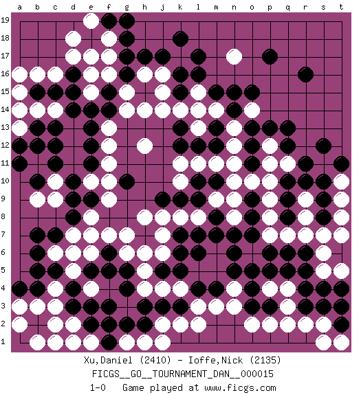 Last move : 1-0 2009 May 31 15:34:36 [Event "FICGS__GO__TOURNAMENT_DAN__000015"] [Site "FICGS"] [Date "2009.01.10"] [Round "1"] [Black "Xu,Daniel"] [White "Ioffe,Nick"] [Result "1-0"] [Rating 1 "2410"] [Rating 2 "2135"] 1.r16 d17 2.d4 q3 3.q5 r7 4.r3 r2 5.r4 s2 6.o5 n3 7.r10 p7 8.n6 p10 9.q12 n8 10.l6 k4 11.m8 n9 12.n7 k17 13.p17 c10 14.h3 c6 15.c5 e6 16.f3 k10 17.m4 m3 18.l4 l3 19.k5 j4 20.c15 c16 21.d15 f16 22.c12 b11 23.b12 b16 24.f14 n17 25.q8 q7 26.o8 p8 27.o9 o10 28.o7 p9 29.o13 n12 30.m10 m9 31.l9 n10 32.l10 l8 33.m7 k8 34.k9 j8 35.j9 h8 36.p3 p2 37.o3 o2 38.p6 h12 39.g10 f12 40.d10 c9 41.e12 f11 42.c11 f10 43.e11 f9 44.k13 h14 45.m13 n13 46.n14 o14 47.p13 r9 48.s10 s5 49.o15 m14 50.n15 l13 51.m12 m11 52.l12 l11 53.k12 k11 54.k15 l15 55.l16 j15 56.l17 k14 57.k16 l14 58.m15 j14 59.j17 b14 60.b10 b9 61.a11 c14 62.b15 a15 63.b13 a13 64.d14 f13 65.e13 c3 66.b4 b3 67.d3 c4 68.b5 d5 69.b6 d2 70.e2 c1 71.b2 a2 72.c7 d6 73.b7 b1 74.d9 j2 75.g5 g6 76.f5 h6 77.f6 e8 78.e7 d7 79.d8 f7 80.e5 e7 81.j3 k2 82.h2 h4 83.g4 e4 84.e3 g1 85.g2 e1 86.g17 f17 87.g18 h1 88.f2 f18 89.f19 e19 90.g19 e17 91.s8 r8 92.s9 s7 93.k3 h5 94.f1 l2 95.s3 p4 96.o4 q4 97.r5 n4 98.n5 q11 99.r11 j16 100.k18 q2 101.p5 j1 102.g16 g14 103.f15 e15 104.e14 e16 105.c13 a14 106.a12 a16 107.o12 n11 108.q10 p11 109.q9 t8 110.k7 j7 111.s4 t9 112.q13 t10 113.t11 t7 114.s12 t5 115.r6 s6 116.t2 s1 117.d1 c2 118.a4 h16 119.h17 g15 120.e9 j6 121.k6 e10 122.l7 e1 123.t4 d1 124.d16 d18 125.t3 a3 126.q6 p12 127.o11 t1 128.j5 g7 129.pass 1-0 Here are the names of the openings (joseki) played in the four corners : Corner q4 : q3 q5 Komoku (Somok, Xiao~mu`) 3-4 Point. The komoku (3-4) point is the traditional corner enclosure move.. Ikken Takagakari (Hankan Nop'dakeolch'im, Yi Gaogua`jiao~, 1-Space High Approach). The 5-4 approach move has become more popular in modern times, as modern Go emphasizes speed and influence. Corner d16 : d17 c15 Komoku (Somok, Xiao~mu`) 3-4 Point. The komoku (3-4) point is the traditional corner enclosure move.. Ikken Kakari (Hankan Keolch'im, Yi Gua`jiao~, 1-Space Low Pincer). The small knight move is the basic approach move to the 3-4 point stone. It has been continually used for over four centuries. There are limitless variations, with new moves constantly being discovered. Black 2 opens the door to a treaure store of joseki. Player Black won this Go (weiqi, baduk) game. Follow this game move after move (download)Studying go is a wonderful way to develop both the creative as well as the logical abilities of children because to play it both sides of the brain are necessary. (Cho Chikun) Methinks King Thibault should dub Marius Zubac a knight of the square board... I mean table, henceforth addressing him as Sir Marius, and bestow on him a suitable land from the kingdom of FICGS & marry him off to a worthy, fair maiden, lest he slice our heads with his mighty sword in his wrath. (Dinesh De Silva)