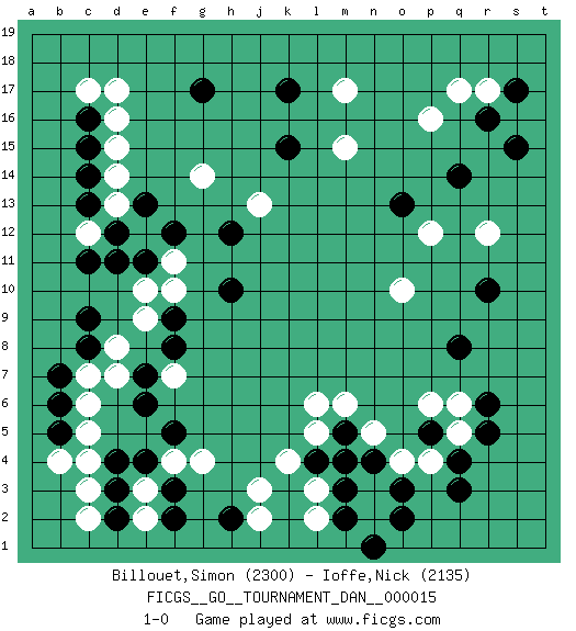 Last move : 1-0 2009 February 7 20:3:57 [Event "FICGS__GO__TOURNAMENT_DAN__000015 "] [Site "FICGS"] [Date "2009.01.10"] [Round "1"] [Black "Billouet,Simon "] [White "Ioffe,Nick "] [Result "1-0"] [Rating 1 "2300"] [Rating 2 "2135"] 1.r16 d17 2.c15 c12 3.d12 d13 4.c13 d14 5.c14 d15 6.c16 d16 7.c11 e12 8.d11 p16 9.k17 m17 10.g17 c17 11.k15 c4 12.q3 q5 13.q8 o4 14.p5 p4 15.q4 p6 16.r5 q6 17.r6 j3 18.q14 r17 19.s17 q17 20.s15 m15 21.e4 e3 22.f3 f4 23.d3 e2 24.d4 c6 25.f2 c3 26.d2 c2 27.o2 n2 28.o3 n3 29.n4 n5 30.m4 l3 31.l4 k4 32.m3 l5 33.m2 l2 34.m5 m6 35.n1 l6 36.f5 g4 37.c8 r12 38.r10 p12 39.o13 o10 40.b5 c5 41.b6 c7 42.b7 b4 43.e6 d7 44.f8 d8 45.c9 e9 46.f9 e10 47.e11 f10 48.f12 f11 49.e13 g14 50.h2 j2 51.h12 j13 52.h10 f7 53.e7 1-0 Here are the names of the openings (joseki) played in the four corners : Corner d16 : d17 c15Komoku (Somok, Xiao~mu`) 3-4 Point. The komoku (3-4) point is the traditional corner enclosure move..Ikken Kakari (Hankan Keolch'im, Yi Gua`jiao~, 1-Space Low Pincer). The small knight move is the basic approach move to the 3-4 point stone. It has been continually used for over four centuries. There are limitless variations, with new moves constantly being discovered. Black 2 opens the door to a treaure store of joseki. Corner q16 : r16 p16Komoku (Somok, Xiao~mu`) 3-4 Point. The komoku (3-4) point is the traditional corner enclosure move..Ikken Takagakari (Hankan Nop'dakeolch'im, Yi Gaogua`jiao~, 1-Space High Approach). The 5-4 approach move has become more popular in modern times, as modern Go emphasizes speed and influence. Corner q4 : q3 q5Komoku (Somok, Xiao~mu`) 3-4 Point. The komoku (3-4) point is the traditional corner enclosure move..Ikken Takagakari (Hankan Nop'dakeolch'im, Yi Gaogua`jiao~, 1-Space High Approach). The 5-4 approach move has become more popular in modern times, as modern Go emphasizes speed and influence. Player Black won this Go (weiqi, baduk) game.Follow this game move after move (download ) Win the stones, lose the game. (Anonymous) Life is verb, not a noun. (Charlotte Perkins Gilman)