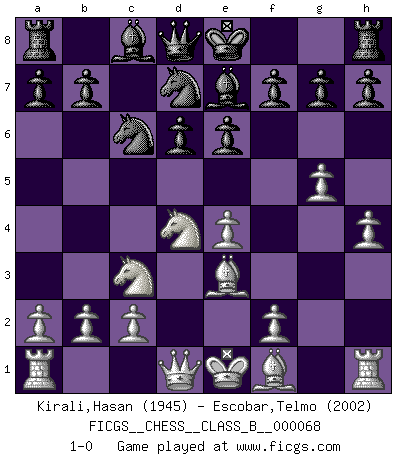 Last move : 1-0 2009 February 25 9:44:14 [Event "FICGS__CHESS__CLASS_B__000068"] [Site "FICGS"] [Date "2009.01.10"] [Round "1"] [White "Kirali,Hasan"] [Black "Escobar,Telmo"] [Result "1-0"] [WhiteElo "1945"] [BlackElo "2002"] 1.e4 c5 2.Nf3 e6 3.d4 cxd4 4.Nxd4 Nf6 5.Nc3 d6 6.g4 Nc6 7.g5 Nd7 8.Be3 Be7 9.h4 1-0 This chess game has been lost on time (started : 2009.01.10 17:58:28) Sicilian : Anderssen variation Player White won this chess game. Follow this game move after move (download)It is the aim of the modern school, not to treat every position according to one general law, but according to the principle inherent in the position. (Richard Reti) Korrekt heißt in Deutschland die Haltung eines Mannes, dessen Benehmen nach dem Urteile seiner Nachbarn seiner Stellung angemessen ist. Um korrekt zu sein, muß man sich der Meinung der anderen anpassen... (Emanuel Lasker) El Ajedrez es una guerra en un tablero. El objetivo es aplastar la mente del oponente. (Bobby Fischer) Le moment que je préfère le plus dans une rencontre, c'est celui où je sens que la personnalité de l'adversaire se brise. (Robert Fischer) I fear not the man who has practiced 10,000 kicks once, but I fear the man who has practiced one kick 10,000 times. (Bruce Lee)