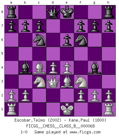 Last move : 1-0 2009 March 20 11:25:23 [Event "FICGS__CHESS__CLASS_B__000068"] [Site "FICGS"] [Date "2009.01.10"] [Round "1"] [White "Escobar,Telmo"] [Black "Kane,Paul"] [Result "1-0"] [WhiteElo "2002"] [BlackElo "1800"] 1.d4 d5 2.c4 Nc6 3.Nc3 dxc4 4.Nf3 Nf6 5.e4 Bg4 6.Be3 e6 7.Bxc4 Bb4 8.Qd3 1-0 This chess game has been lost on time (started : 2009.01.10 17:58:28) QGD : Chigorin defense, Janowski variation Player White won this chess game. Follow this game move after move (download)One bad move nullifies forty good ones. (Horowitz) Nicht daß Diemer aus Opportunismus Mitglied der NSDAP geworden wäre. Er war ein Fanatiker, in allem, was er tat. (Hans Ree) El Ajedrez es en su esencia, un juego. En su forma, un arte. Y en su ejecución, una ciencia. (Baron Tassilo) Toutes les manuvres exécutées sur une colonne ouverte ont pour but ultime l'intrusion définitive sur la septième ou la huitième rangée, en plein cur de la position ennemie. (Aaron Nimzovitch) At work, the authority of a person is inversely proportional to the number of pens that person is carrying. (Dan Rotaru)