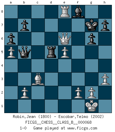 Last move : 1-0 2009 September 5 5:28:13 [Event "FICGS__CHESS__CLASS_B__000068"] [Site "FICGS"] [Date "2009.01.10"] [Round "1"] [White "Robin,Jean"] [Black "Escobar,Telmo"] [Result "1-0"] [WhiteElo "1800"] [BlackElo "2002"] 1.e4 c5 2.d4 cxd4 3.c3 dxc3 4.Nxc3 e6 5.Nf3 a6 6.Bd3 d6 7.O-O Nf6 8.h3 Nc6 9.Qe2 Be7 10.Rd1 Qc7 11.Bf4 Ne5 12.Rac1 Qb8 13.Bb1 O-O 14.a4 Bd7 15.a5 Rc8 16.Nxe5 dxe5 17.Be3 Bc6 18.Bd3 Be8 19.Qf3 Nd7 20.Qg3 Kh8 21.Na4 Rxc1 22.Rxc1 Qd8 23.Nb6 Nxb6 24.Bxb6 Qd6 25.Bc7 Qb4 26.Bxe5 Bf8 27.Rc7 Rd8 28.Bc3 Qb3 29.Bc2 Qb5 30.Qh4 Rd7 31.e5 g6 32.Rc8 Rd5 33.Bxg6 fxg6 34.Qf6+ Kg8 35.Qxe6+ Kg7 36.Rxe8 1-0 Sicilian : Smith-Morra gambit Kingside Castling by player White (move 7) Kingside Castling by player Black (move 13) Player White won this chess game. Follow this game move after move (download)The Pin is mightier than the sword. (Fred Reinfeld) Das Schach hält seine Meister in eigenen Banden, Fesseln; auf vielerlei Weise formt es ihren Geist, so dass die innere Freiheit selbst des Stärksten beeinflusst wird. (Albert Einstein) Muchos se han convertido en Maestros de Ajedrez, nadie se ha convertido en el Maestro del Ajedrez. (Siegbert Tarrasch) Le pion, dans sa simplicité, marche droit devant lui, mais lorsqu'il prend, il le fait obliquement? Ainsi l'homme, tant qu'il reste pauvre, marche dans la droiture et vit honnêtement, mais lorsqu'il recherche les honneurs, il flatte, se parjure et, par les voies obliques, cherche une position supérieure sur l'échiquier du monde. (Jean de Galles) Art is the only way to run away without leaving home. (Twyla Tharp)