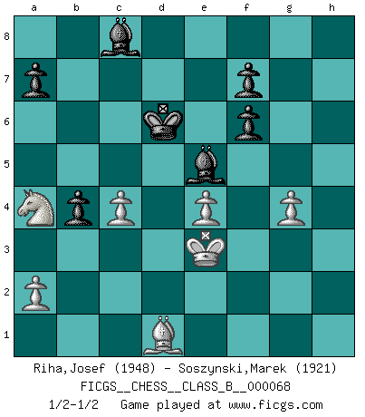 Last move : 1/2-1/2 2009 January 13 22:52:35 [Event "FICGS__CHESS__CLASS_B__000068"] [Site "FICGS"] [Date "2009.01.10"] [Round "1"] [White "Riha,Josef"] [Black "Soszynski,Marek"] [Result "1/2-1/2"] [WhiteElo "1948"] [BlackElo "1921"] 1.d4 d5 2.c4 e6 3.Nc3 c6 4.e3 Nf6 5.Nf3 Nbd7 6.Qc2 Bd6 7.Be2 O-O 8.O-O dxc4 9.Bxc4 b5 10.Be2 Bb7 11.Rd1 Qc7 12.e4 e5 13.Bg5 exd4 14.Rxd4 Ne5 15.Bxf6 gxf6 16.h3 b4 17.Na4 c5 18.Rd2 Nxf3+ 19.Bxf3 Bh2+ 20.Kh1 Bf4 21.R2d1 c4 22.Rd4 Rac8 23.Bg4 Rfd8 24.Rad1 Rxd4 25.Rxd4 Be5 26.Rd7 Qa5 27.b3 Rc7 28.Rxc7 Qxc7 29.Qxc4 Qxc4 30.bxc4 Bd4 31.Bd1 Bxf2 32.Bc2 Bd4 33.Kh2 Kf8 34.Kg3 Ke7 35.Kf4 h5 36.g4 Be5+ 37.Ke3 hxg4 38.hxg4 Kd6 39.Bd1 Bc8 1/2-1/2 QGD : Semi-Slav Kingside Castling by player Black (move 7) Kingside Castling by player White (move 8) This chess game ended in a draw. Follow this game move after move (download)I know people who have all the will in the world, but still can't play good Chess. (Bobby Fischer) Wenn Spassky eine Figur opfert kannst du genauso gut aufgeben. Aber wenn Tal eine Figur opfert, spiel weiter. Er könnte noch eine weitere opfern, und dann ... wer weiß? (Miguel Najdorf) El Ajedrez hace al hombre ser mas sabio y ver mas claro. (Vladimir Putin) Même un GMI sait rarement calculer sur plus de cinq coups une attaque à sacrifices. (Rudolf Spielmann) I feel so... helpless. (C-3PO in Star Wars ep.3)