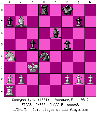 Last move : 1/2-1/2 2009 March 30 6:8:3 [Event "FICGS__CHESS__CLASS_B__000068"] [Site "FICGS"] [Date "2009.01.10"] [Round "1"] [White "Soszynski,Marek"] [Black "Vasquez,Fernando"] [Result "1/2-1/2"] [WhiteElo "1921"] [BlackElo "1981"] 1.e4 e5 2.Nf3 Nf6 3.Nxe5 d6 4.Nf3 Nxe4 5.c4 Be7 6.d4 O-O 7.Bd3 Ng5 8.Nxg5 Bxg5 9.Qh5 Re8+ 10.Kd1 Bxc1 11.Qxh7+ Kf8 12.Qh8+ Ke7 13.Qh4+ Kf8 14.Qxd8 Rxd8 15.Kxc1 d5 16.Rd1 Nc6 17.cxd5 Rxd5 18.Nc3 Rxd4 19.Be4 Rxd1+ 20.Kxd1 Nd4 21.Kd2 c5 22.Na4 f5 23.Bd5 Be6 24.Bxb7 Rd8 25.Kc3 Nb5+ 26.Kc2 Nd4+ 27.Kc3 1/2-1/2 Petrov : Kaufmann attack Kingside Castling by player Black (move 6) This chess game ended in a draw. Follow this game move after move (download)It is the aim of the modern school, not to treat every position according to one general law, but according to the principle inherent in the position. (Richard Reti) Ich rechne überhaupt nicht voraus. Ich gewinne auch so. (Robert James Fischer) Ciertamente, de todas la drogas del mundo, el Ajedrez debe ser el mas placentero permamentemente. (Assiac) Psychologiquement, tu dois avoir confiance en toi même, mais cette confiance doit être basée sur des faits. (Robert Fischer) A bird doesn't sing because it has an answer, it sings because it has a song. (Maya Angelou)