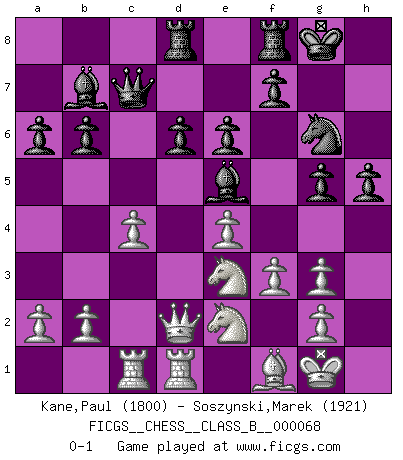 Last move : 0-1 2009 April 14 2:44:1 [Event "FICGS__CHESS__CLASS_B__000068"] [Site "FICGS"] [Date "2009.01.10"] [Round "1"] [White "Kane,Paul"] [Black "Soszynski,Marek"] [Result "0-1"] [WhiteElo "1800"] [BlackElo "1921"] 1.d4 c5 2.e3 e6 3.Nf3 b6 4.Bd3 Nf6 5.O-O Bb7 6.c4 g6 7.Nc3 Bg7 8.e4 cxd4 9.Nxd4 O-O 10.Bg5 d6 11.Qd2 a6 12.Rad1 Nbd7 13.Rfe1 Ne5 14.Nc2 Rc8 15.Ne3 h6 16.Bh4 g5 17.Bg3 Qc7 18.f3 Nh5 19.Bf1 Nxg3 20.hxg3 Rcd8 21.Rc1 Ng6 22.Red1 Be5 23.Ne2 h5 0-1 Old Benoni defense Kingside Castling by player White (move 5) Kingside Castling by player Black (move 9) Player Black won this chess game. Follow this game move after move (download)Any material change in a position must come about by mate, a capture, or a Pawn promotion. (Purdy) Ich brauche nur einen Blick auf das Schachbrett zu werfen, und weiß schon, was in der Stellung steckt, was geschehen kann und was geschehen wird. Alle übrigen suchen und prüfen, ich aber weiß es! (José Raúl Capablanca) Una partida de Ajedrez se divide en 3 etapas: la primera cuando piensas que tienes la ventaja, la segunda cuando crees que tienes la ventaja y la tercera... ¡cuando te das cuenta que vas a perder!. (Savielly Tartakower) Botvinnik disait en comparant les échecs à la musique: Il existe une science dont le but est l'étude de l'acoustique et des sons. Mais il y a aussi un art qui se sert de l'océan des sons : c'est la musique. De toute évidence, il en est de même pour la pensée. La logique est l'étude des lois de la réflexion et les échecs reflètent, en tant qu'art, le côté logique de la réflexion, sous la forme d'images artistiques... Extrait de Fischer - Spassky, Reykjavik 1972 par Alexander & F. Wyndham (Ed. Solar), p 37. All maxims have their antagonist maxims; proverbs should be sold in pairs, a single one being but a half truth. (William Mathews)