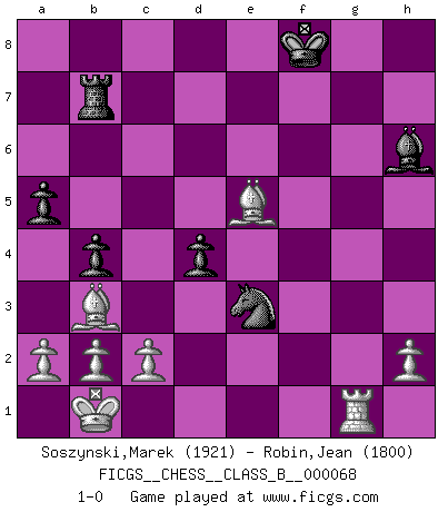 Last move : 1-0 2009 March 1 19:54:50 [Event "FICGS__CHESS__CLASS_B__000068"] [Site "FICGS"] [Date "2009.01.10"] [Round "1"] [White "Soszynski,Marek"] [Black "Robin,Jean"] [Result "1-0"] [WhiteElo "1921"] [BlackElo "1800"] 1.e4 d6 2.d4 Nf6 3.Nc3 g6 4.Be3 Bg7 5.Qd2 c6 6.f3 b5 7.g4 h5 8.g5 Nfd7 9.f4 Nb6 10.Nf3 Bg4 11.Nh4 b4 12.Nd1 a5 13.f5 gxf5 14.Nxf5 Bxf5 15.exf5 N8d7 16.Bf2 c5 17.Bb5 Qc7 18.dxc5 dxc5 19.f6 exf6 20.Bg3 Qb7 21.Nf2 O-O 22.O-O-O Qf3 23.Rhf1 Ra7 24.Nh3 Qe4 25.Rde1 Qd4 26.Qxd4 cxd4 27.Rf5 fxg5 28.Rxg5 f6 29.Rxh5 Ne5 30.Bf2 Rd8 31.Rd1 Rd5 32.Be2 Rad7 33.Nf4 R5d6 34.Bb5 Rd8 35.Rg1 Nd5 36.Nd3 Rb8 37.Ba4 Kf8 38.Bg3 Rb7 39.Bb3 Ne3 40.Nxe5 fxe5 41.Bxe5 Rh6 42.Rxh6 Bxh6 43.Kb1 1-0 Pirc defense Kingside Castling by player Black (move 21) Queenside Castling by player White (move 22) Player White won this chess game. Follow this game move after move (download)I guess a certain amount of temperament is expected of Chess geniuses. (Ron Gross) Wenn Du einsam bist, wenn Du Dich in der Welt wie ein Fremder fühlst, spiele Schach. Das wird Deinen Geist erheben und Dein Ratgeber im Kampf sein. (Aristoteles) ¿Porque tengo que perder ante este idiota?. (Aron Nimzovich) Les échecs sont plus proches de l'art de l'assassinat que de l'art de la guerre. (Arturo Perez-Reverte) For to win one hundred victories in one hundred battles is not the acme of skill. To subdue the enemy without fighting is the acme of skill. (Sun Tzu)