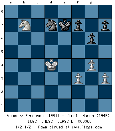 Last move : 1/2-1/2 2009 July 27 20:20:14 [Event "FICGS__CHESS__CLASS_B__000068"] [Site "FICGS"] [Date "2009.01.10"] [Round "1"] [White "Vasquez,Fernando"] [Black "Kirali,Hasan"] [Result "1/2-1/2"] [WhiteElo "1981"] [BlackElo "1945"] 1.e4 c5 2.d4 cxd4 3.c3 dxc3 4.Nxc3 Nc6 5.Nf3 e6 6.Bc4 d6 7.O-O Nf6 8.Qe2 Be7 9.Rd1 e5 10.Be3 O-O 11.Rac1 Be6 12.h3 Bxc4 13.Qxc4 Rc8 14.Qd3 Re8 15.a3 a6 16.Bg5 Nh5 17.Bxe7 Qxe7 18.Qxd6 Qxd6 19.Rxd6 Red8 20.Rcd1 Rxd6 21.Rxd6 Nf6 22.Nd5 Nxe4 23.Rxc6 Rxc6 24.Ne7+ Kf8 25.Nxc6 bxc6 26.Nxe5 c5 27.f3 Nf6 28.Nc6 Ke8 29.Nb8 a5 30.a4 Nd5 31.Nc6 c4 32.Kf2 c3 33.bxc3 Nxc3 34.Ke3 Nxa4 35.Kd4 Nb6 36.Nxa5 Ke7 37.g4 g6 38.Nb7 Nd7 1/2-1/2 Sicilian : Smith-Morra gambit Kingside Castling by player White (move 7) Kingside Castling by player Black (move 10) 10 pieces endgame at move 36 : White KNPPP , Black KNPPP WHITE : King + 1 Knight 3 Pawns BLACK : King + 1 Knight 3 Pawns This chess game ended in a draw. Follow this game move after move (download)The chessboard is the world, the pieces are the phenomena of the Universe, the rules of the game are what we call the laws of Nature and the player on the other side is hidden from us. (Thomas Huxley) Es macht mich traurig, wenn ich sehe, dass Golfprofis mehr verdienen als Schachsportler. Obwohl ich davon überzeugt bin, dass wir Schachspieler viel härter trainieren müssen als die Golfer. (Alexandra Kosteniuk) ¿Quién es tu oponente esta tarde? Esta tarde mi oponente son las piezas negras. (Akiba Rubinstein) Je crois qu'il existe des manières très spécifiques de jouer efficacement contre une machine. Evidemment, nous n'avons aucune chance en technique pure, parce que l'ordinateur calcule de manière parfaite. Mais lorsque nous faisons appel à notre cerveau, en utilisant l'intuition et la compréhension, alors nous restons beaucoup plus forts. (Anatoli Karpov) Do not put your faith in what statistics say until you have carefully considered what they do not say. (William W. Watt)