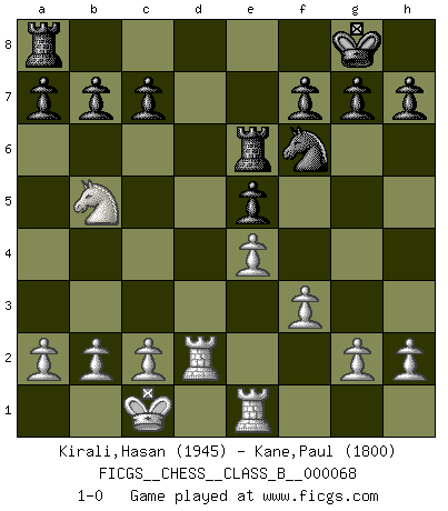 Last move : 1-0 2009 April 13 14:38:25 [Event "FICGS__CHESS__CLASS_B__000068"] [Site "FICGS"] [Date "2009.01.10"] [Round "1"] [White "Kirali,Hasan"] [Black "Kane,Paul"] [Result "1-0"] [WhiteElo "1945"] [BlackElo "1800"] 1.e4 e5 2.d4 exd4 3.Qxd4 Nc6 4.Qe3 Nf6 5.Nc3 Bb4 6.Bd2 O-O 7.O-O-O Re8 8.Bc4 d6 9.Nf3 Bg4 10.Rhe1 Qe7 11.Qg5 Ne5 12.Nxe5 Qxe5 13.Qxe5 dxe5 14.f3 Be6 15.Bxe6 Rxe6 16.Nb5 Bxd2+ 17.Rxd2 1-0 This chess game has been lost on time (started : 2009.01.10 17:58:28) Centre game : Berger variation Kingside Castling by player Black (move 6) Queenside Castling by player White (move 7) Player White won this chess game. Follow this game move after move (download)Of all my Russian books, the defense contains and diffuses the greatest 'warmth' which may seem odd seeing how supremely abstract Chess is supposed to be. (Vladimir Nabokov) Schach sollte überall auf der Welt Schulfach werden. Es fördert die geistige Auseinandersetzung. Es lehrt die Demut in der Niederlage. (Garry Kasparov) No puedes jugar al Ajedrez si eres de corazón noble. (Proverbio Francés) Les Echecs mettent en conflit, non pas deux intelligences, mais deux volontés. (Lasker) Every man's memory is his private literature. (Aldous Huxley)