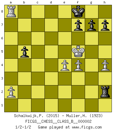 Last move : 1/2-1/2 2006 May 13 10:23:53 [Event "FICGS__CHESS__CLASS_B__000002"] [Site "FICGS"] [Date "2006.04.16"] [Round "1"] [White "Schalkwijk,Peter"] [Black "Muller,Henri-Louis"] [Result "1/2-1/2"] [WhiteElo "2015"] [BlackElo "1923"] 1.g3 d5 2.Bg2 Nf6 3.c4 e6 4.d4 Be7 5.Nf3 O-O 6.O-O dxc4 7.Qc2 a6 8.Qxc4 b5 9.Qc2 Bb7 10.Bf4 Nc6 11.Rd1 Nb4 12.Qc1 Nbd5 13.Nbd2 Nxf4 14.gxf4 c5 15.dxc5 Qc7 16.Nb3 Rac8 17.Ne5 Bxg2 18.Kxg2 Bxc5 19.Nxc5 Qxc5 20.Qxc5 Rxc5 21.Rac1 Rxc1 22.Rxc1 Nd5 23.Kf3 Rd8 24.e4 Nb4 25.Nc6 Nxc6 26.Rxc6 Ra8 27.Kg4 Kf8 28.f5 exf5+ 29.Kxf5 Rd8 30.Rxa6 Rd2 31.f4 Rxb2 32.h4 Rh2 33.Ra8+ 1/2-1/2 Benko's Opening Kingside Castling by player Black (move 5) Kingside Castling by player White (move 6) This chess game ended in a draw. Follow this game move after move (download)When you play Bobby, it is not a question if you win or lose. It is a question if you survive. (Boris Spassky) Capablanka war das größte Genie der Schachgeschichte! Aber denken sie nicht er habe nichts vom Schach verstanden. Er wusste nur soviel wie er wissen musste um seine Ziele zu erreichen. (Mikhail Moiseyevich Botvinik) El ganador de una partida es aquel jugador que hace el penúltimo error. (Savielly Tartakover) Le système Elo représente seulement une moyenne. Il est simplement un indicateur de votre stabilité. (Anatoli Karpov) Opportunities multiply as they are seized. (Sun Tzu)