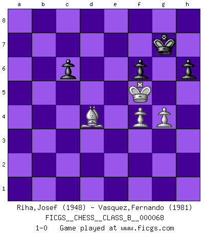 Last move : 1-0 2009 October 1 21:28:20 [Event "FICGS__CHESS__CLASS_B__000068"] [Site "FICGS"] [Date "2009.01.10"] [Round "1"] [White "Riha,Josef"] [Black "Vasquez,Fernando"] [Result "1-0"] [WhiteElo "1948"] [BlackElo "1981"] 1.e4 e5 2.Nf3 Nf6 3.Nxe5 d6 4.Nf3 Nxe4 5.d4 d5 6.Bd3 Nc6 7.O-O Be7 8.c4 Nb4 9.Be2 O-O 10.Nc3 Re8 11.Qb3 a5 12.a3 Nxc3 13.bxc3 a4 14.Qb1 Nc6 15.Bd3 g6 16.cxd5 Qxd5 17.Re1 Bg4 18.Be4 Qc4 19.Qxb7 Bxf3 20.Bxf3 Na5 21.Qb1 Rad8 22.Be3 Nb3 23.Ra2 Qxc3 24.Rc2 Qa5 25.Bc6 Bxa3 26.Ra2 Re6 27.d5 Rxc6 28.dxc6 Bd6 29.g3 a3 30.Rd1 Rb8 31.Rd3 Qf5 32.Bh6 Qe6 33.Re3 Qc4 34.Rae2 f6 35.Rc2 Qa4 36.Rd2 Bf8 37.Rxb3 Qxb3 38.Qxb3+ Rxb3 39.Rd8 Kf7 40.Rxf8+ Ke6 41.Ra8 Rc3 42.h4 Kd5 43.Kg2 Kxc6 44.Bf8 Kd5 45.Rxa3 Rxa3 46.Bxa3 Ke4 47.f3+ Kd5 48.Kf2 Ke6 49.Ke3 Kd5 50.g4 Ke5 51.Bb2+ Ke6 52.Ke4 c6 53.h5 Kf7 54.hxg6+ Kxg6 55.f4 h6 56.Bd4 Kg7 57.Kf5 1-0 Petrov : Classical attack Kingside Castling by player White (move 7) Kingside Castling by player Black (move 9) 10 pieces endgame at move 46 : White KBPPP , Black KPPPP WHITE : King + 1 Bishop 3 Pawns BLACK : King + 4 Pawns 9 pieces endgame at move 54 : White KBPPP , Black KPPP WHITE : King + 1 Bishop 3 Pawns BLACK : King + 3 Pawns 8 pieces endgame at move 54 : White KBPP , Black KPPP WHITE : King + 1 Bishop 2 Pawns BLACK : King + 3 Pawns Player White won this chess game. Follow this game move after move (download)The isolated Pawn casts gloom over the entire chessboard. (Aaron Nimzovich) Das Schachspiel ist ein See, in welchem eine Mücke baden und ein Elefant ertrinken kann. (Emanuel Lasker) Hasta este punto, las blancas han seguido un análisis bien conocido. Pero ahora el hace un error fatal: empieza a usar su propia cabeza. (Siegbert Tarrasch) C'est une question de caractère, Beaucoup de gens perdent leur motivation très vite. D'autres, ils sont rares, peuvent la conserver très longtemps. J'aime les échecs, encore aujourd'hui je suis heureux d'analyser des parties. J'aime toujours gagner, je déteste encore perdre. Bien jouer est important pour mon intégrité intellectuelle et morale. Et puis les échecs vivent en ce moment une période historique grâce à Internet. Ils se développent dans les systèmes éducatifs à travers le monde. Ils sortent de leur ghetto, et c'est mon rôle de mener à bien cette révolution. (Gary Kasparov) They say poker is a zero-sum game. It must be, because every time I play my sum ends up zero. (Max Shapiro)