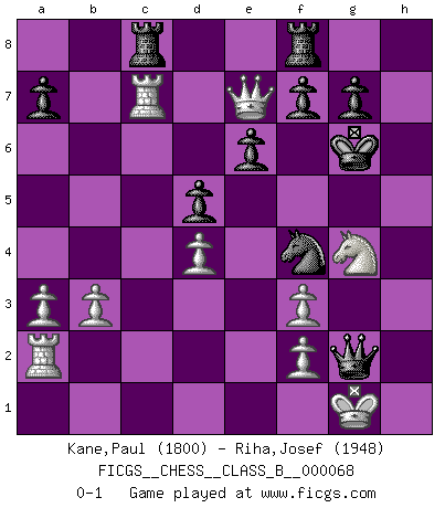 Last move : 0-1 2009 February 12 21:16:22 [Event "FICGS__CHESS__CLASS_B__000068"] [Site "FICGS"] [Date "2009.01.10"] [Round "1"] [White "Kane,Paul"] [Black "Riha,Josef"] [Result "0-1"] [WhiteElo "1800"] [BlackElo "1948"] 1.d4 Nf6 2.Nf3 d5 3.e3 c6 4.Bd3 Bg4 5.Nbd2 Nbd7 6.h3 Bh5 7.c4 e6 8.b3 Qa5 9.Qc2 Bxf3 10.gxf3 c5 11.O-O cxd4 12.exd4 Bd6 13.c5 Bf4 14.a3 Qd8 15.Re1 Nh5 16.Nf1 Qh4 17.c6 bxc6 18.Qxc6 O-O 19.Qxd7 Qg5+ 20.Kh1 Bxc1 21.Rexc1 Nf4 22.Bxh7+ Kxh7 23.Ne3 Qh4 24.Ra2 Qxh3+ 25.Kg1 Kg6 26.Rc7 Rad8 27.Qe7 Rc8 28.Ng4 Qg2+ 0-1 Queen's pawn game Kingside Castling by player White (move 11) Kingside Castling by player Black (move 18) Player Black won this chess game. Follow this game move after move (download)First-class players lose to second class players because second-class players sometimes play a first-class game. (Tarrasch) Ich hatte meine größten Erfolge, als ich 47 Jahre alt war. Kasparow war noch nicht mal 42 und hat das Schach schon im Stich gelassen. (Viktor Kortschnoi) El Ajedrez es una guerra en un tablero. El objetivo es aplastar la mente del oponente. (Bobby Fischer) Si je n'étais pas joueur d'échecs, je serais le meilleur dans quelque chose d'autre. (Anatoli Karpov) I think your argument is specious - I think your tie is ugly. (Gregory House to Dr. Foreman, House M.D.)