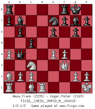 Last move : 1/2-1/2 2009 February 2 15:20:56 [Event "FICGS__CHESS__RAPID_M__000015"] [Site "FICGS"] [Date "2009.01.11"] [Round "1"] [White "Amos,Frank"] [Black "Unger,Peter"] [Result "1/2-1/2"] [WhiteElo "2235"] [BlackElo "2169"] 1.e4 c5 2.Nc3 Nc6 3.f4 g6 4.Nf3 Bg7 5.Bc4 e6 6.O-O Nge7 7.d3 O-O 8.a4 d5 9.Ba2 b6 10.Qe1 dxe4 11.dxe4 Nd4 12.Qf2 Nxf3+ 13.Qxf3 Qd4+ 14.Kh1 Bb7 15.Rd1 Qb4 1/2-1/2 Sicilian : Grand Prix attack Kingside Castling by player White (move 6) Kingside Castling by player Black (move 7) This chess game ended in a draw. Follow this game move after move (download)Fischer is completely natural. He plays no roles. He's like a child. Very, very simple. (Zita Rajcsanyi) Schach ist ein Reich, wo sich die menschliche Phantasie frei entfalten kann. (David Bronstein) Robert Fischer es la ley hacia si mismo. (Larry Evans) La tactique, c'est ce que vous faites quand il y a quelque chose à faire; la stratégie, c'est ce que vous faites quand il n'y a rien à faire. (Savielli Tartacower) I believe in luck. How else can you explain the success of those you dislike ? (Jean Cocteau)