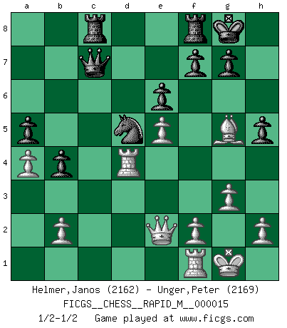 Last move : 1/2-1/2 2009 March 1 13:38:46 [Event "FICGS__CHESS__RAPID_M__000015"] [Site "FICGS"] [Date "2009.01.11"] [Round "1"] [White "Helmer,Janos"] [Black "Unger,Peter"] [Result "1/2-1/2"] [WhiteElo "2162"] [BlackElo "2169"] 1.Nf3 Nf6 2.c4 e6 3.d4 d5 4.Nc3 c6 5.e3 Nbd7 6.Bd3 dxc4 7.Bxc4 b5 8.Be2 Bb7 9.O-O a6 10.e4 c5 11.e5 Nd5 12.a4 b4 13.Ne4 Qc7 14.Qd3 cxd4 15.Qxd4 Bc5 16.Nxc5 Nxc5 17.Qg4 h5 18.Qc4 a5 19.Bg5 Ba6 20.Qc2 Bxe2 21.Qxe2 Nb3 22.Rad1 Rc8 23.Nd4 Nxd4 24.Rxd4 O-O 25.g3 1/2-1/2 Reti Opening Kingside Castling by player White (move 9) Kingside Castling by player Black (move 24) This chess game ended in a draw. Follow this game move after move (download)Life is a kind of Chess, with struggle, competition, good and ill events. (Benjamin Franklin) Je älter ich werde, um so mehr schätze ich die Bauern. (Paul Keres) Aquellos que dicen entender al Ajedrez, no entienden nada. (Robert Hubner) Donnez-moi un Cavalier en 6e et je gagnerais toutes mes parties. (Steinitz) Lottery : A tax on people who are bad at math. (Author unknown)