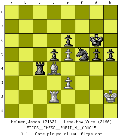 Last move : 0-1 2009 June 25 15:28:47 [Event "FICGS__CHESS__RAPID_M__000015"] [Site "FICGS"] [Date "2009.01.11"] [Round "1"] [White "Helmer,Janos"] [Black "Lemekhov,Yura"] [Result "0-1"] [WhiteElo "2162"] [BlackElo "2166"] 1.Nf3 Nf6 2.g3 d5 3.Bg2 c6 4.O-O Bf5 5.d3 e6 6.Nbd2 h6 7.Qe1 Be7 8.e4 Bh7 9.Qe2 O-O 10.b3 a5 11.a4 Na6 12.Bb2 Nb4 13.Ne1 b5 14.c3 Na6 15.e5 Nd7 16.axb5 cxb5 17.d4 Qb6 18.Nd3 Rfc8 19.Rfc1 Nab8 20.c4 bxc4 21.bxc4 Nc6 22.cxd5 exd5 23.e6 Bxd3 24.Qxd3 fxe6 25.Qe2 Nd8 26.Rxc8 Rxc8 27.Nf3 Nf6 28.Ne5 Ra8 29.Nd3 a4 30.Nc5 Qb4 31.Rc1 a3 32.Bc3 Qb6 33.Ba1 a2 34.Bf1 Ra3 35.Bb2 Ra7 36.Ba1 Kf7 37.Qe3 Nd7 38.Nd3 Bg5 39.Qf3+ Kg8 40.Rd1 Qb1 41.Qe2 Rc7 42.h4 Be7 43.Qe1 Rb7 44.Nb2 Qc2 45.Rc1 Qb3 46.Rc8 Kf7 47.Qe2 Nf6 48.Ra8 Rb8 49.Ra6 Rc8 50.Qe3 Qxe3 51.fxe3 Ne4 52.Rxa2 Nxg3 53.Nd3 Nxf1 54.Kxf1 Bxh4 55.Kg2 h5 56.Kh3 Bf6 57.Rf2 g5 58.Bb2 Kg6 59.Ne5+ Bxe5 60.dxe5 Rc7 61.Rf6+ Kg7 62.Bd4 Rc6 63.Kg2 Nf7 64.Kg3 Nh6 65.Rf2 Nf5+ 66.Kh2 Rc4 67.Rd2 Kg6 0-1 Reti Opening Kingside Castling by player White (move 4) Kingside Castling by player Black (move 9) Player Black won this chess game. Follow this game move after move (download)Help your pieces so they can help you. (Paul Morphy) Wer nie einen Fehler gemacht hat, hat nie etwas Neues ausprobiert. (Albert Einstein) Si pudieramos observar el interior de la cabeza de un jugador de Ajedrez, encontraríamos ahí un mundo lleno de sentimientos, imágenes, ideas, emoción y pasión. (Alfred Binet) Il n'y a pas eu de défaite parce que je ne crois pas que cet ordinateur ait jamais existé. IBM a triché en refusant d'imprimer les modes de recherche de la machine. C'est évident, pendant le match, des coups décisifs ont été joués par des êtres humains. Aujourd'hui, les meilleurs spécialistes en informatique ne peuvent toujours pas expliquer comment Deep-Blue a pu jouer contre la logique des ordinateurs. IBM a gagné une guerre de communication, mais ils sont incapables de prouver que l'ordinateur a gagné tout seul. (Garry Kasparov) It is the aim of the modern school, not to treat every position according to one general law, but according to the principle inherent in the position. (Richard Reti)