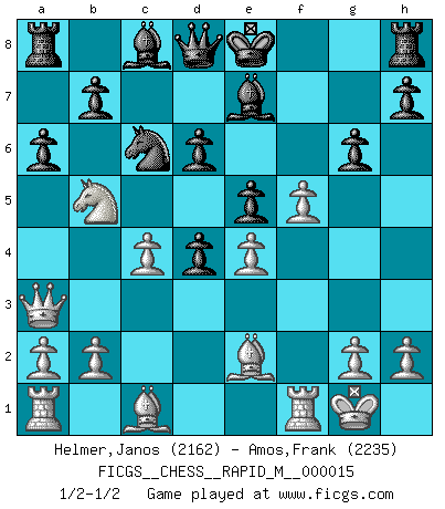 Last move : 1/2-1/2 2009 March 13 15:17:6 [Event "FICGS__CHESS__RAPID_M__000015"] [Site "FICGS"] [Date "2009.01.11"] [Round "1"] [White "Helmer,Janos"] [Black "Amos,Frank"] [Result "1/2-1/2"] [WhiteElo "2162"] [BlackElo "2235"] 1.Nf3 d6 2.d4 g6 3.c4 Bg7 4.Nc3 c5 5.e4 Nc6 6.d5 Nd4 7.Be2 e5 8.dxe6 fxe6 9.O-O Ne7 10.Nxd4 cxd4 11.Nb5 Nc6 12.Qb3 Bf6 13.Qg3 e5 14.f4 a6 15.Qa3 Be7 16.f5 1/2-1/2 Reti Opening Kingside Castling by player White (move 9) This chess game ended in a draw. Follow this game move after move (download)Chess is no whit inferior to the violin, and we have a large number of professional violinists. (Mikhail Botvinnik) Im Reiche der Wirklichkeit ist man nie so glücklich wie im Reiche der Gedanken. (Arthur Schopenhauer) ¿Se han dado cuenta de que Fischer casi nunca ha tenido piezas malas? El las intercambia y las piezas malas se quedan con sus oponenets. (Yuri Balashov) Le thème de l'attaque double intervient d'une manière ou d'une autre dans l'immense majorité des combinaisons. (Youri Averbakh) When you stop learning you start dying. (M. Scott Adams)