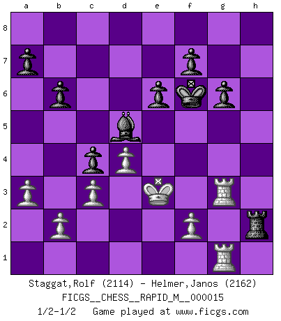 Last move : 1/2-1/2 2009 May 29 9:4:30 [Event "FICGS__CHESS__RAPID_M__000015"] [Site "FICGS"] [Date "2009.01.11"] [Round "1"] [White "Staggat,Rolf"] [Black "Helmer,Janos"] [Result "1/2-1/2"] [WhiteElo "2114"] [BlackElo "2162"] 1.e4 e6 2.d4 d5 3.e5 c5 4.c3 Nc6 5.Nf3 Qb6 6.a3 c4 7.Nbd2 Na5 8.Be2 Bd7 9.O-O Nh6 10.Re1 Be7 11.Rb1 Nf5 12.Qc2 h6 13.Bd1 O-O 14.g4 Nh4 15.Nxh4 Bxh4 16.Nf3 Be7 17.g5 hxg5 18.Nxg5 g6 19.Qe2 Kg7 20.Qg4 Nb3 21.Bf4 Rh8 22.h4 Rh6 23.Nf3 Rh5 24.Bg5 Bxg5 25.Nxg5 Nd2 26.Rc1 Ne4 27.Qf4 Nxg5 28.Qf6+ Kg8 29.Bxh5 Nh7 30.Qe7 Bc6 31.Bd1 Re8 32.Qb4 Qd8 33.Bf3 Qxh4 34.Re3 Ng5 35.Bg2 Kg7 36.Kf1 Qf4 37.Rce1 Rh8 38.Qe7 Rh5 39.Ke2 Rh2 40.Qf6+ Qxf6 41.exf6+ Kxf6 42.Rg1 Kf5 43.Bxd5 Bxd5 44.Re5+ Kf6 45.Rexg5 b6 46.R5g3 Be4 47.Ke3 Bd5 1/2-1/2 French : Advance, Paulsen attack Kingside Castling by player White (move 9) Kingside Castling by player Black (move 13) This chess game ended in a draw. Follow this game move after move (download)At this time Fischer is simply a level above all the best Chessplayers in the world. (John Jacobs) Vom Schach wurde gesagt das Leben sei dafür nicht lange genug. Aber das ist der Fehler des Lebens, nicht des Schach'. (Irving Chernev) Una buena ofensiva y una buena defensa, comienzan ambas con un buen desarrollo. (Bruce A. Moon) Le moment que je préfère le plus dans une rencontre, c'est celui où je sens que la personnalité de l'adversaire se brise. (Robert Fischer) Whatever you do, don't be bored. This is absolutely the most exciting time we could have possibly hoped to be alive. And things are just starting. (From movie Waking life)