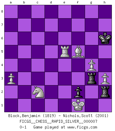 Last move : 0-1 2009 April 1 15:18:22 [Event "FICGS__CHESS__RAPID_SILVER__000007"] [Site "FICGS"] [Date "2009.01.12"] [Round "2"] [White "Block,Benjamin"] [Black "Nichols,Scott"] [Result "0-1"] [WhiteElo "1819"] [BlackElo "2001"] 1.e4 c5 2.Nf3 d6 3.d4 cxd4 4.Nxd4 Nf6 5.Nc3 a6 6.Be3 Ng4 7.Bg5 h6 8.Bh4 g5 9.Bg3 Bg7 10.h3 Ne5 11.Nf5 Bxf5 12.exf5 Nbc6 13.Nd5 e6 14.fxe6 fxe6 15.Ne3 O-O 16.Be2 d5 17.O-O Qb6 18.Ng4 Ng6 19.c3 Qxb2 20.Qd3 Nce7 21.Qe3 Rae8 22.Qxe6+ Kh7 23.Bf3 Qxc3 24.Rac1 Qd4 25.Ne3 Nc6 26.Qxd5 Qxd5 27.Bxd5 Nd4 28.Bc4 Nf4 29.Bxf4 gxf4 30.Nd5 h5 31.Bd3+ Kh6 32.Rb1 b5 33.Nc7 Re5 34.Nxa6 f3 35.g3 h4 36.g4 Ne2+ 37.Kh2 Rd8 38.Nb4 Rc5 39.Bf5 Bc3 40.a3 Be5+ 41.Kh1 Rc3 42.Nc2 Rd2 43.Rxb5 Ng3+ 44.fxg3 hxg3 45.Rxe5 Rh2+ 46.Kg1 f2+ 47.Rxf2 gxf2+ 48.Kf1 Rg3 0-1 Sicilian : Najdorf, Byrne (English) attack Kingside Castling by player Black (move 15) Kingside Castling by player White (move 17) Player Black won this chess game. Follow this game move after move (download)Chess is thirty to forty percent psychology. You don't have this when you play a computer. I can't confuse it. (Judith Polgar) Du kannst im Schach nur gut werden, wenn du das Spiel liebst. (Robert James Fischer) Fischer era un maestro de claridad y un Rey del posicionamiento astuto. Sus oponentes podían ver hacia donde se dirigía pero eran impotentes para detenerlo. (Bruce Pandolfini) Pour moi, les échecs ne sont pas un jeu mais un art. (Alexandre Alekhine) Tomorrow's what you make of it. (Horatio Caine, C.S.I. Miami)