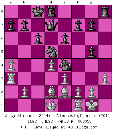 Last move : 0-1 2009 March 16 22:58:18 [Event "FICGS__CHESS__RAPID_A__000058"] [Site "FICGS"] [Date "2009.01.13"] [Round "1"] [White "Wingo,Michael"] [Black "Vidanovic,Djordje"] [Result "0-1"] [WhiteElo "2014"] [BlackElo "2011"] 1.d4 d5 2.c4 c6 3.Nf3 Nf6 4.e3 Bf5 5.Nc3 e6 6.Nh4 Bg6 7.Be2 Nbd7 8.O-O dxc4 9.Nxg6 hxg6 10.Bxc4 Qc7 11.h3 Nb6 12.Be2 O-O-O 13.a4 Nbd5 14.Bd2 g5 15.Nb5 Qd7 16.Na3 Bxa3 17.Rxa3 Ne4 0-1 This chess game has been lost on time (started : 2009.01.13 15:14:54) QGD Slav : 4.e3 Bf5 Kingside Castling by player White (move 8) Queenside Castling by player Black (move 12) Player Black won this chess game. Follow this game move after move (download)When asked, -How is that you pick better moves than your opponents?, I responded: I'm very glad you asked me that, because, as it happens, there is a very simple answer. I think up my own moves, and I make my opponent think up his. (Alexander Alekhine) Wenn Dein Gegner dir ein Remis anbietet, versuch herauszufinden, weshalb er glaubt schlechter zu stehen. (Nigel Short) Un mal día en el Ajedrez, es mejor que cualquier buen día en el trabajo. (Anonymous) Le joueur d'Echecs qui veut atteindre le top est obligé de développer son propre credo créatif. Alexeï Stepanovicth Souétine. Il est facile d'écrire des livres ! Ce qui est difficile, c'est de jouer ! (Alexeï Stepanovicth Souétine) Watch your thoughts; they become words. Watch your words; they become actions. Watch your actions; they become habits. Watch your habits; they become character. Watch your character; it becomes your destiny. (Frank Outlaw)