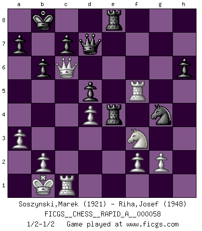 Last move : 1/2-1/2 2009 January 16 18:18:56 [Event "FICGS__CHESS__RAPID_A__000058"] [Site "FICGS"] [Date "2009.01.13"] [Round "1"] [White "Soszynski,Marek"] [Black "Riha,Josef"] [Result "1/2-1/2"] [WhiteElo "1921"] [BlackElo "1948"] 1.Nf3 Nf6 2.d4 e6 3.Bg5 h6 4.Bf4 b6 5.e3 Bb7 6.h3 Nc6 7.Be2 g5 8.Bh2 d6 9.c4 Qd7 10.Qc2 O-O-O 11.Nc3 Rg8 12.e4 g4 13.hxg4 Nxg4 14.Bg3 Kb8 15.a3 Ne7 16.Bh4 f5 17.Bd3 Re8 18.O-O-O fxe4 19.Bxe4 Bxe4 20.Nxe4 Nf5 21.Ng3 Nxh4 22.Rxh4 Be7 23.Rh5 d5 24.cxd5 exd5 25.Kb1 Bd6 26.Nf5 Re4 27.Nxd6 Qxd6 28.Rc1 Rge8 29.Rf5 Qd7 30.Qc6 1/2-1/2 Reti Opening Queenside Castling by player Black (move 10) Queenside Castling by player White (move 18) This chess game ended in a draw. Follow this game move after move (download)The hardest game to win is a won game. (Emanuel Lasker) Ich bin es gewohnt, das die Jugend mir überhaupt keinen Respekt entgegenbringt. (Alexander Morozewich) ¡Examina movidas que hagan daño! Un buen ojo for movidas desvastantes es mucho mas importante que el conocimiento de principios estratégicos. (Purdy) Echiquier : carré parfait, comme la Jérusalem nouvelle décrite par l'auteur de l'Apocalypse, huit cases sur huit, exaltation du chiffre 4, symbole du cosmos aux quatre horizons... où le noir et le blanc, l'ombre et la lumière, le mal et le bien s'entremêlent et se conjuguent. (Robert Couffignal, Le Gambit du poète) For peace of mind, resign as general manager of the universe. (Douglas Adams)
