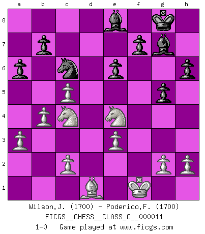 Last move : 1-0 2007 February 12 16:9:10 [Event "FICGS__CHESS__CLASS_C__000011"] [Site "FICGS"] [Date "2006.08.24"] [Round "1"] [White "Wilson,Jaimie"] [Black "Poderico,Francesco"] [Result "1-0"] [WhiteElo "1700"] [BlackElo "1700"] 1.e4 d5 2.exd5 Qxd5 3.Nc3 Qd6 4.d4 Nf6 5.Nf3 a6 6.Be2 e6 7.O-O Be7 8.Qd3 O-O 9.Ne5 Rd8 10.Rd1 c5 11.dxc5 Qxd3 12.Rxd3 Rxd3 13.Nxd3 Nc6 14.Be3 Bd7 15.Rd1 Be8 16.Bf3 Rd8 17.Kf1 h6 18.a3 g5 19.b4 Bf8 20.Ne4 Nd5 21.Nb2 Bg7 22.Nc4 Nxe3+ 23.fxe3 Rxd1+ 24.Bxd1 1-0 Scandinavian : Pytel-Wade variation Kingside Castling by player White (move 7) Kingside Castling by player Black (move 8) Player White won this chess game. Follow this game move after move (download)Fischer prefers to enter Chess history alone. (Miguel Najdorf) Wenn es im Universum noch irgendwo intelligente Lebewesen gibt, dann kennen sie Go. (Emanuel Lasker) Las leyes del Ajedrez no permiten una libre elección: tienes que mover quieras o no. (Emanuel Lasker) Avant la finale, les dieux ont créé le milieu de partie. (Tarrasch) Heh, heh, heh. Time to abandon ship. (General Grievous in Star Wars ep.3)