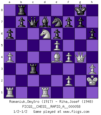 Last move : 1/2-1/2 2009 January 23 12:22:1 [Event "FICGS__CHESS__RAPID_A__000058"] [Site "FICGS"] [Date "2009.01.13"] [Round "1"] [White "Romaniuk,Dmytro"] [Black "Riha,Josef"] [Result "1/2-1/2"] [WhiteElo "1917"] [BlackElo "1948"] 1.d4 Nf6 2.c4 e6 3.Nc3 Bb4 4.Qc2 O-O 5.Nf3 c5 6.dxc5 Na6 7.g3 Nxc5 8.Bg2 Nce4 9.O-O Nxc3 10.bxc3 Be7 11.Rd1 Qc7 12.Qd3 Rd8 13.Nd4 a6 14.Rb1 d5 15.cxd5 Nxd5 16.Bd2 Nf6 17.Qf3 h6 18.h3 Rb8 19.a4 Rd5 20.e4 Ra5 21.Ra1 Rc5 22.e5 Nd7 23.Bf4 Rxc3 24.Qh5 Nf8 25.Nf5 Bg5 26.Nd6 Bxf4 27.gxf4 Ng6 28.Qg4 Bd7 29.Be4 Ne7 30.Kh2 1/2-1/2 Nimzo-Indian : Classical variation Kingside Castling by player Black (move 4) Kingside Castling by player White (move 9) This chess game ended in a draw. Follow this game move after move (download)First-class players lose to second class players because second-class players sometimes play a first-class game. (Tarrasch) Es ist nicht das erste mal, dass sich die FIDE dem Arabischen Geld gebeugt hat (über die FIDE WM 2004 in Lybien). (Larry Evans) No es tiempo de jugar al Ajedrez cuando la casa esta en llamas. (Proverbio Italiano) Les ravages du H expliquent la différence de niveau entre Tal et Thal [Abergel]. I teach you to lie, cheat and steal, and as soon as my back's turned you wait in line ? (Gregory House, House M.D.)
