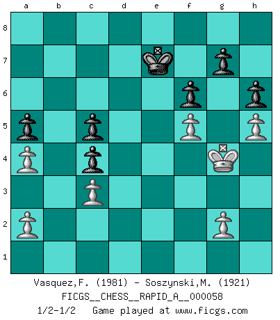 Last move : 1/2-1/2 2009 April 9 11:37:54 [Event "FICGS__CHESS__RAPID_A__000058"] [Site "FICGS"] [Date "2009.01.13"] [Round "1"] [White "Vasquez,Fernando"] [Black "Soszynski,Marek"] [Result "1/2-1/2"] [WhiteElo "1981"] [BlackElo "1921"] 1.e4 Nc6 2.Nf3 e5 3.d4 exd4 4.Nxd4 Nf6 5.Nxc6 bxc6 6.Bd3 d5 7.exd5 cxd5 8.O-O Be7 9.Nc3 O-O 10.Bf4 Rb8 11.b3 a6 12.Qf3 Bb4 13.Na4 Re8 14.c3 Bd6 15.Rfe1 Bd7 16.Bxd6 cxd6 17.Qf4 Qc7 18.Rxe8+ Rxe8 19.Qd4 Bb5 20.f3 Bxa4 21.bxa4 Qc6 22.h3 Rb8 23.Rb1 Rxb1+ 24.Bxb1 Nd7 25.Bc2 Nb6 26.Kf2 a5 27.Bb3 Kf8 28.f4 h6 29.f5 Qc5 30.Ke3 f6 31.Kf4 Qc6 32.Kg3 Nc4 33.Kg4 Ke7 34.Kh4 Kf8 35.Kg3 Kg8 36.Kf4 Kf8 37.Kf3 Kf7 38.Kf2 Kg8 39.Kg1 Kf8 40.Kh2 Kf7 41.h4 Kf8 42.Kg3 Kg8 43.Kg4 Kf8 44.Kf3 Kg8 45.Kg3 Kh8 46.Kh3 Kg8 47.h5 Kf8 48.Kg3 Qc5 49.Qxc5 dxc5 50.Bxc4 dxc4 51.Kg4 Ke7 1/2-1/2 KP : Nimzovich defense Kingside Castling by player White (move 8) Kingside Castling by player Black (move 9) This chess game ended in a draw. Follow this game move after move (download)I am the best player in the world and I am here to prove it. (Bobby Fischer) Die Neutralität betrachte ich als eine schwere Krankheit. (Viktor Kortschnoi) La única cosa que los jugadores de Ajedrez tienen en común, es el Ajedrez. (Lodewijk Prins) Les réformistes prétendent que les progrès de la théorie conduiront à la disparition des échecs, et qu'il faut, pour leur rendre vie, en remanier les règles. En réalité, qu'exprime cette affirmation? Le mépris de l'intuition, de l'imagination et de tous les autres éléments qui font des échecs un art. (Alexander Alekhine) The only thing that overcomes hard luck is hard work. (Harry Golden)