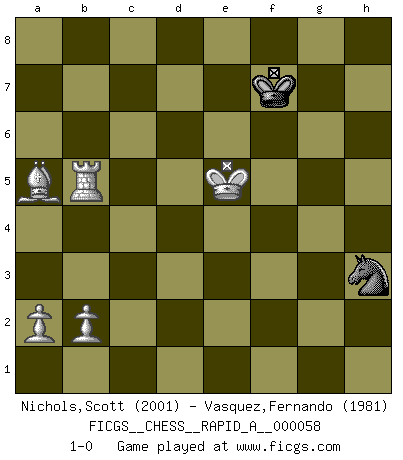 Last move : 1-0 2009 April 22 3:1:10 [Event "FICGS__CHESS__RAPID_A__000058"] [Site "FICGS"] [Date "2009.01.13"] [Round "1"] [White "Nichols,Scott"] [Black "Vasquez,Fernando"] [Result "1-0"] [WhiteElo "2001"] [BlackElo "1981"] 1.e4 e5 2.d4 exd4 3.c3 dxc3 4.Nxc3 Nc6 5.Nf3 Nf6 6.e5 Ng4 7.Qe2 Bc5 8.h3 Nxf2 9.Bg5 Nd4 10.Qd2 Nxf3+ 11.gxf3 f6 12.exf6 gxf6 13.Be3 Nxh1 14.Bxc5 d6 15.O-O-O Be6 16.Qf4 a6 17.Bd4 Qd7 18.Bxf6 Rf8 19.Re1 d5 20.Qh6 Qd6 21.Be5 Qe7 22.Bd4 Kd7 23.Nxd5 Qd6 24.Nf6+ Rxf6 25.Bxf6 b5 26.Qxh7+ Kc8 27.Be5 Qc6+ 28.Kb1 Qd7 29.Qh4 Qd8 30.Qe4 Qd5 31.Qxd5 Bxd5 32.h4 Kb7 33.h5 Rf8 34.h6 Bg8 35.Kc1 Bh7 36.Re2 Rf5 37.f4 Rh5 38.Bg2+ Kc8 39.Bf6 Rxh6 40.Bg5 Rh5 41.Bf3 Bg6 42.Re6 Rh3 43.Bc6 Bh5 44.Rf6 Kb8 45.Rf8+ Ka7 46.Be7 Kb6 47.Rf6 Nf2 48.Bg2 c6 49.Rxc6+ Ka7 50.Bc5+ Kb7 51.Rh6 Kc8 52.Bxh3+ Nxh3 53.Rxh5 Nxf4 54.Rh6 a5 55.Kc2 Nd5 56.Rh5 Nf4 57.Rf5 Ne6 58.Kd3 Kb7 59.Ke4 Kc6 60.Rf6 Kd7 61.Bb6 Ke7 62.Ke5 Ng5 63.Bxa5 Nh3 64.Rb6 Kf7 65.Rxb5 1-0 Danish gambit Queenside Castling by player White (move 15) 10 pieces endgame at move 53 : White KRBPPP , Black KNPP WHITE : King + 1 Rook 1 Bishop 3 Pawns BLACK : King + 1 Knight 2 Pawns 9 pieces endgame at move 53 : White KRBPP , Black KNPP WHITE : King + 1 Rook 1 Bishop 2 Pawns BLACK : King + 1 Knight 2 Pawns 8 pieces endgame at move 63 : White KRBPP , Black KNP WHITE : King + 1 Rook 1 Bishop 2 Pawns BLACK : King + 1 Knight 1 Pawn 7 pieces endgame at move 65 : White KRBPP , Black KN WHITE : King + 1 Rook 1 Bishop 2 Pawns BLACK : King + 1 Knight Player White won this chess game. Follow this game move after move (download)What is the object of playing a gambit opening?... To acquire a reputation of being a dashing player at the cost of losing a game. (Siegbert Tarrasch) Immer nach dem besten Zug zu suchen ist ziemlich unpraktisch. (Nigel Short) La mitad de las variaciones que son calculadas en una partida de torneo, resultan ser completamente superfluas. Desafortunadamente, nadie sabe por adelantado cual mitad. (Jan Tinman) La tactique est l'élément le plus important du milieu de jeu. (Siegbert Tarrasch) All battles are fought by scared men who'd rather be someplace else. (John Wayne in the movie In harm's way)