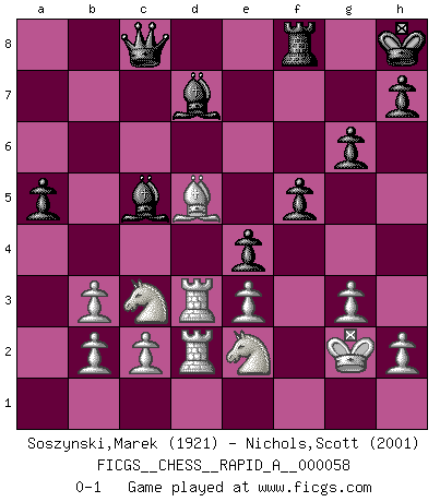 Last move : 0-1 2009 January 22 8:27:54 [Event "FICGS__CHESS__RAPID_A__000058"] [Site "FICGS"] [Date "2009.01.13"] [Round "1"] [White "Soszynski,Marek"] [Black "Nichols,Scott"] [Result "0-1"] [WhiteElo "1921"] [BlackElo "2001"] 1.e4 c5 2.d4 cxd4 3.Qxd4 Nc6 4.Qa4 g6 5.Nf3 Bg7 6.Bd3 d6 7.O-O Bd7 8.Qb3 Nf6 9.Qxb7 O-O 10.Nc3 a5 11.Qb3 Rb8 12.Qa3 Bg4 13.Be3 d5 14.exd5 Nxd5 15.Be4 Nxe3 16.fxe3 Nb4 17.Rf2 Qc7 18.Nd4 Bd7 19.Rd1 Be5 20.g3 Bd6 21.Qb3 Nd3 22.Rxd3 Rxb3 23.axb3 Bc5 24.Kg2 Qc8 25.Rfd2 f5 26.Bf3 e5 27.Bd5+ Kh8 28.Nde2 e4 0-1 Sicilian : Smith-Morra gambit Kingside Castling by player White (move 7) Kingside Castling by player Black (move 9) Player Black won this chess game. Follow this game move after move (download)Chess is a cold bath for the mind. (Sir John Simon) Die Idee von Capablanca, Schach als Fach in den Schulen zu lehren, ist großartig. (Fidel Castro) No soy una persona materialista y por eso, no resiento la falta o pérdida del dinero. La ausencia de cosas mundanas carece de importancia. Ya que el Ajedrez es una forma en la que puedo ser tan materialista como yo desee sin tener la necesidad de vender mi alma. (Jamie Walter Adams) Ce qui est bien, c'est d'avoir tout un tas de pièces en prise : l'adversaire ne peut en prendre qu'une à la fois. Cité par Thierry Audin. If only faces could talk... (Pat Summerall, Sportscaster during the Super Bowl)