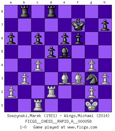 Last move : 1-0 2009 March 17 23:10:13 [Event "FICGS__CHESS__RAPID_A__000058"] [Site "FICGS"] [Date "2009.01.13"] [Round "1"] [White "Soszynski,Marek"] [Black "Wingo,Michael"] [Result "1-0"] [WhiteElo "1921"] [BlackElo "2014"] 1.d4 e6 2.Nd2 d5 3.e4 Be7 4.e5 c5 5.Qg4 Bf8 6.dxc5 Qc7 7.Qg3 Nd7 8.Ngf3 Nh6 9.Bd3 Nxc5 10.Nd4 f6 11.Bb5+ Kf7 12.exf6 Qxg3 13.fxg3 gxf6 14.N2b3 Ng4 15.h3 Ne5 16.O-O a6 17.Be2 Ne4 18.g4 Rg8 19.Nf3 Bd6 20.Nxe5+ Bxe5 21.c3 Ng3 22.Rf2 Bd7 23.Bf3 Rad8 24.Be3 Bc6 25.Na5 Bc7 26.Nxc6 bxc6 27.Rc1 Rb8 28.c4 Be5 29.b3 Rgd8 30.Rd2 1-0 This chess game has been lost on time (started : 2009.01.13 15:14:54) Queen's pawn Kingside Castling by player White (move 16) Player White won this chess game. Follow this game move after move (download)Chess is everything: art, science and sport. (Anatoly Karpov) Als ich elf wurde, wurde ich einfach gut. (Robert James Fischer) El Ajedrez es imaginación. (David Bronstein) Les échecs, c'est l'imagination. (David Bronstein) Every man's memory is his private literature. (Aldous Huxley)