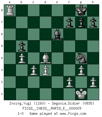 Last move : 1-0 2009 April 10 4:5:8 [Event "FICGS__CHESS__RAPID_E__000009"] [Site "FICGS"] [Date "2009.01.13"] [Round "1"] [White "Inving,Yugi"] [Black "Segovia,Didier"] [Result "1-0"] [WhiteElo "1160"] [BlackElo "0835"] 1.c4 e5 2.g3 c6 3.Bg2 Bb4 4.a3 Ba5 5.Nc3 Nf6 6.Nf3 Bxc3 7.bxc3 e4 8.Nd4 O-O 9.O-O d5 10.d3 Na6 11.cxd5 exd3 12.dxc6 bxc6 13.Nxc6 Qd7 14.Qxd3 Qxd3 15.exd3 Kh8 16.Nb4 Rb8 17.Be3 Nxb4 18.axb4 a6 19.Ba7 Rb5 20.Bc5 Rd8 21.Bc6 Rb8 22.Ba7 Rb5 23.Bxb5 axb5 24.Bd4 Bb7 25.Ra7 Bd5 26.Rfa1 Ng4 27.R7a5 Be6 28.Ra8 Rg8 29.Rxg8+ Kxg8 30.Ra8+ 1-0 English Opening Kingside Castling by player Black (move 8) Kingside Castling by player White (move 9) Player White won this chess game. Follow this game move after move (download)Chess is the art which expresses the science of logic. (Mikhail Botvinnik) Im Leben werden Partien nie so unstrittig gewonnen wie im Spiel (Emanuel Lasker) No existe un remordimiento como el remordimiento del Ajedrez. (H. G. Wells) Aucun coup ne doit être joué sans but. (Pedro Damiano) An expert is a man who has made all the mistakes which can be made in a very narrow field. (Niels Bohr)