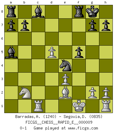 Last move : 0-1 2009 January 17 0:29:3 [Event "FICGS__CHESS__RAPID_E__000009"] [Site "FICGS"] [Date "2009.01.13"] [Round "1"] [White "Barradas,Anderson"] [Black "Segovia,Didier"] [Result "0-1"] [WhiteElo "1240"] [BlackElo "0835"] 1.e4 e5 2.Nf3 d6 3.d4 Be7 4.d5 Bg4 5.Be3 c6 6.c4 Nf6 7.Nc3 Na6 8.a3 Nc5 9.Bxc5 dxc5 10.Be2 O-O 11.Nxe5 Bc8 12.Nd3 Qa5 13.b4 cxb4 14.axb4 Qc7 15.b5 cxd5 16.b6 Qxb6 17.cxd5 Qd4 18.Qd2 Bb4 19.Rc1 Nxe4 20.Qe3 Qxe3 21.fxe3 Bxc3+ 22.Kf1 Nd2+ 23.Kf2 Ba5 24.Nb2 Ne4+ 25.Kf1 f5 0-1 Philidor's defense Kingside Castling by player Black (move 10) Player Black won this chess game. Follow this game move after move (download)I give 98 percent of my mental energy to Chess. Others give only 2 percent. (Bobby Fischer) Gegen einen Schachcomputer zu verlieren ist wie Löcher in den Strümpfen zuhaben. Es ist nicht peinlich, solange man der einzige ist der es weiß. (Anonymous) La única cosa que los jugadores de Ajedrez tienen en común, es el Ajedrez. (Lodewijk Prins) Mais n'est-ce pas déjà le limiter injurieusement que d'appeler les échecs un jeu? N'est-ce pas aussi une science, un art, ou quelque chose qui, comme le cercueil de Mahomet entre ciel et terre, est suspendu entre l'un et l'autre, et qui réunit un nombre incroyable de contraires ? (Stefan Zweig) Don't be irreplaceable, if you can't be replaced, you can't be promoted. (Dan Rotaru)