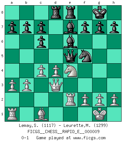 Last move : 0-1 2009 January 22 20:49:12 [Event "FICGS__CHESS__RAPID_E__000009"] [Site "FICGS"] [Date "2009.01.13"] [Round "1"] [White "Lemay,Simon"] [Black "Leurette,Marc-Antoine"] [Result "0-1"] [WhiteElo "1117"] [BlackElo "1299"] 1.e4 e5 2.Nf3 Nc6 3.Bb5 Nf6 4.O-O Nxe4 5.Re1 Nd6 6.Bxc6 dxc6 7.Nxe5 Be7 8.d4 O-O 9.b3 Nf5 10.Bb2 Be6 11.c4 Bb4 12.Re2 Qg5 13.Qd3 Rfe8 14.a3 Be7 15.Nc3 Rad8 16.Ne4 Qf4 17.Bc1 Qxe5 0-1 Ruy Lopez : Berlin defense, Open variation Kingside Castling by player White (move 4) Kingside Castling by player Black (move 8) Player Black won this chess game. Follow this game move after move (download)Though most people love to look at the games of the great attacking masters, some of the most successful players in history have been the quiet positional players. They slowly grind you down by taking away your space, tying up your pieces, and leaving you with virtually nothing to do ! (Yasser Seirawan) Wenn du nicht weißt was du tun sollst, warte bis dein Gegner eine Idee hat. Sie wird sicher schlecht sein. (Siegbert Tarrasch) La mitad de las variaciones que son calculadas en una partida de torneo, resultan ser completamente superfluas. Desafortunadamente, nadie sabe por adelantado cual mitad. (Jan Tinman) Echiquier : carré parfait, comme la Jérusalem nouvelle décrite par l'auteur de l'Apocalypse, huit cases sur huit, exaltation du chiffre 4, symbole du cosmos aux quatre horizons... où le noir et le blanc, l'ombre et la lumière, le mal et le bien s'entremêlent et se conjuguent. (Robert Couffignal, Le Gambit du poète) Question: Is 'This statement is paradoxical' a paradoxical statement ? Or is it a meta-paradox ? (Normajean Yates)