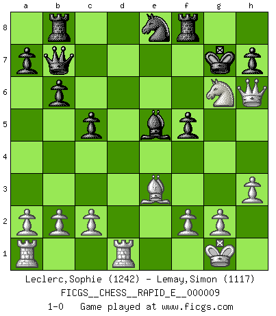 Last move : 1-0 2009 February 23 4:6:32 [Event "FICGS__CHESS__RAPID_E__000009"] [Site "FICGS"] [Date "2009.01.13"] [Round "1"] [White "Leclerc,Sophie"] [Black "Lemay,Simon"] [Result "1-0"] [WhiteElo "1242"] [BlackElo "1117"] 1.e4 g6 2.Nf3 Bg7 3.d4 d6 4.Nc3 Nf6 5.Bd3 O-O 6.Be3 Nbd7 7.O-O b6 8.h3 c5 9.e5 dxe5 10.dxe5 Ne8 11.Be4 Rb8 12.Qd3 Bb7 13.Rfd1 Bxe4 14.Qxe4 Qc7 15.Nd5 Qb7 16.Nxe7+ Kh8 17.Qf4 f5 18.Qh4 Nxe5 19.Nxe5 Bxe5 20.Nxg6+ Kg7 21.Qh6+ 1-0 Robatsch (Modern) defense Kingside Castling by player Black (move 5) Kingside Castling by player White (move 7) Player White won this chess game. Follow this game move after move (download)In complicated positions, Bobby Fischer hardly had to be afraid of anybody. (Paul Keres) Je mehr ich von der FIDE weiss, um so weniger verstehe ich. (Alexander Kalifman) Juega la Apertura como un libro, el Juego Medio como un mago y los Finales como una máquina. (Spielmann) Demandez au pauvre Cg1 ce qu'il en pense. Eduard Gufeld à propos de la variante Saemisch de l'Est-Indienne. I believe in luck. How else can you explain the success of those you dislike ? (Jean Cocteau)