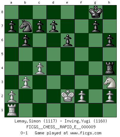 Last move : 0-1 2009 April 18 15:13:16 [Event "FICGS__CHESS__RAPID_E__000009"] [Site "FICGS"] [Date "2009.01.13"] [Round "1"] [White "Lemay,Simon"] [Black "Inving,Yugi"] [Result "0-1"] [WhiteElo "1117"] [BlackElo "1160"] 1.d4 f5 2.c4 e6 3.Nc3 Nf6 4.g3 Be7 5.Bg2 O-O 6.Nf3 b6 7.O-O Bb7 8.Re1 Nc6 9.e4 fxe4 10.Ng5 Na5 11.b3 Bb4 12.Ngxe4 Nxe4 13.Nxe4 Bxe1 14.Qxe1 Qe8 15.Bf4 Rxf4 16.gxf4 Qf7 17.Qe3 Rf8 18.Ng5 Qxf4 19.Bxb7 Nxb7 20.Qxf4 Rxf4 21.Kf1 h6 22.Nh3 Rxd4 23.Ke2 Rh4 0-1 This chess game has been lost on time (started : 2009.01.13 22:8:12) Dutch defense, Rubinstein variation Kingside Castling by player Black (move 5) Kingside Castling by player White (move 7) Player Black won this chess game. Follow this game move after move (download)I prefer to lose a really good game than to win a bad one. (David Levy) Moralische Siege zählen nicht. (Savielly Grigorievitsch Tartakower) El ganador de una partida es aquel jugador que hace el penúltimo error. (Savielly Tartakover) Nous vivons dans un monde échiquéen : chaque jour qui passe est un défi à relever. (Philosophe Sasha) The only thing that matters is the evidence. (Horatio Caine, C.S.I. Miami)