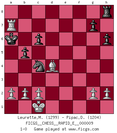 Last move : 1-0 2009 January 15 12:57:34 [Event "FICGS__CHESS__RAPID_E__000009"] [Site "FICGS"] [Date "2009.01.13"] [Round "1"] [White "Leurette,Marc-Antoine"] [Black "Pipac,Darko"] [Result "1-0"] [WhiteElo "1299"] [BlackElo "1204"] 1.e4 e5 2.Nf3 Nc6 3.Bc4 h6 4.d4 exd4 5.Nxd4 Nf6 6.Nxc6 dxc6 7.Qxd8+ Kxd8 8.Nc3 Bb4 9.Bd2 Bxc3 10.Bxc3 Nxe4 11.O-O-O Bd7 12.Rhe1 Nxf2 13.Rd2 Ng4 14.Red1 Ne3 15.Rxd7+ Kc8 16.R1d3 Nxc4 17.Rxf7 b5 18.R3d7 Kb7 19.Rxc7+ Kb6 20.Bd4+ Ka6 21.Rxa7+ Rxa7 22.Rxa7+ 1-0 King's pawn game Queenside Castling by player White (move 11) Player White won this chess game. Follow this game move after move (download)Chess is the gymnasium of the mind. (Blaise Pascal) Obwohl ich vom Stil her kaum zu den Priestern der Schachkunst gezählt werde, halte ich Schach doch für eine Kunst. (Tigran Petrosjan) Botvinnik trataba de restarle el misterio al Ajedrez, siempre relacionandolo a situaciones de la vida ordinaria. El gustaba de llamar al Ajedrez un típico problema inexacto similar a aquellos de los cuales la gente siempre tiene que enfrentarse en la vida cotidiana. (Garry Kasparov) La solitude du joueur d'Echecs à l'approche du mat est semblable à celle du condamné. (Francis Szpiner) The weakness of an artist is dogma. (Josh Waitzkin)