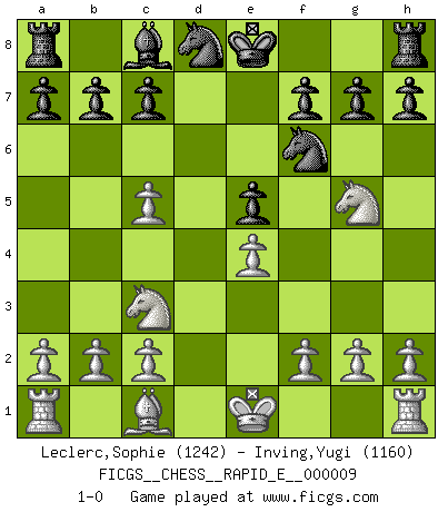 Last move : 1-0 2009 February 10 4:7:38 [Event "FICGS__CHESS__RAPID_E__000009"] [Site "FICGS"] [Date "2009.01.13"] [Round "1"] [White "Leclerc,Sophie"] [Black "Inving,Yugi"] [Result "1-0"] [WhiteElo "1242"] [BlackElo "1160"] 1.e4 e5 2.Nf3 Nc6 3.Bc4 Nf6 4.Ng5 Bc5 5.d4 d5 6.Bxd5 Nxd5 7.dxc5 Nf6 8.Qxd8+ Nxd8 9.Nc3 1-0 Two knights defense : Wilkes Barre (Traxler) variation Player White won this chess game. Follow this game move after move (download)Every Pawn is a potential Queen. (James Mason) Schach ist Kampf, hauptsächlich jedoch gegen die eigenen Fehler. (Savielly Grigorievitsch Tartakower) El Ajedrez es como la guerra en un tablero. (Bobby Fischer) C'est la seule position que je connaisse où les deux camps sont mals. Propos prêtés à V. Anand. If passion drives you, let reason holds the reins. (Benjamin Franklin)