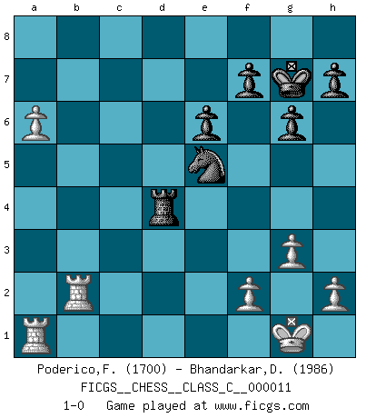 Last move : 1-0 2006 October 24 13:44:0 [Event "FICGS__CHESS__CLASS_C__000011"] [Site "FICGS"] [Date "2006.08.24"] [Round "1"] [White "Poderico,Francesco"] [Black "Bhandarkar,Dinesh"] [Result "1-0"] [WhiteElo "1700"] [BlackElo "1986"] 1.d4 d5 2.c4 e6 3.Nc3 Nf6 4.Bg5 Nbd7 5.e3 Be7 6.Nf3 O-O 7.Rc1 c6 8.Bd3 dxc4 9.Bxc4 Nd5 10.Bxe7 Qxe7 11.Ne4 N5f6 12.Nxf6+ Nxf6 13.O-O b6 14.Ne5 Bb7 15.Be2 Rac8 16.Qa4 c5 17.Qxa7 Nd5 18.Ba6 Bxa6 19.Qxa6 Ra8 20.Qc4 cxd4 21.Nc6 Qc7 22.exd4 Rfc8 23.Ne7+ Nxe7 24.Qxc7 Rxc7 25.Rxc7 Nd5 26.R7c1 g6 27.a3 Kg7 28.Rc2 b5 29.Rfc1 b4 30.Rc8 Ra7 31.Ra1 bxa3 32.bxa3 Ra4 33.g3 Rxd4 34.Ra8 Nb6 35.Rb8 Nd5 36.a4 Nf6 37.a5 Ng4 38.Rb2 Ne5 39.a6 1-0 QGD Kingside Castling by player Black (move 6) Kingside Castling by player White (move 13) Player White won this chess game. Follow this game move after move (download)Chess is the gymnasium of the mind. (Blaise Pascal) Dass jemand wie Surab Asmaiparaschwili, der selbst Elopunkte gekauft hat , Vize-Präsident der Fide werden konnte, sagt schon einges über den Zustand dieser Organisation aus. (Joel Lautier) La señal de un Gran Maestro es su habilidad de ganar una partida rápidamente y sin dolor. (Irving Chernev) Le système Elo représente seulement une moyenne. Il est simplement un indicateur de votre stabilité. (Anatoli Karpov) The right perception of any matter and a misunderstanding of the same matter do not wholly exclude each other. (Kafka's the trial)