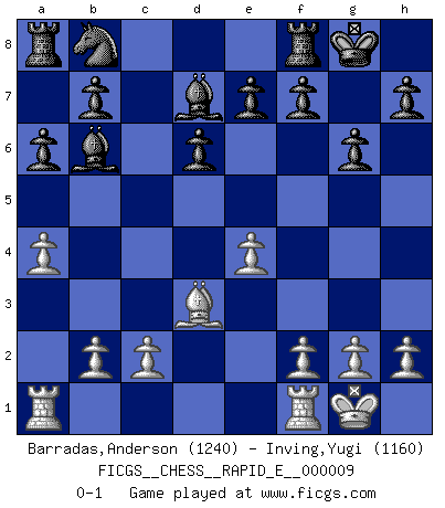 Last move : 0-1 2009 February 15 6:27:6 [Event "FICGS__CHESS__RAPID_E__000009"] [Site "FICGS"] [Date "2009.01.13"] [Round "1"] [White "Barradas,Anderson"] [Black "Inving,Yugi"] [Result "0-1"] [WhiteElo "1240"] [BlackElo "1160"] 1.e4 c5 2.Nf3 d6 3.d4 cxd4 4.Nxd4 Nf6 5.Nc3 g6 6.Be3 Bg7 7.Bd3 O-O 8.O-O Bd7 9.Ncb5 Ng4 10.Qe2 Nxe3 11.Qxe3 Qb6 12.a4 a6 13.Nc3 Bxd4 14.Nd5 Bxe3 15.Nxb6 Bxb6 0-1 Sicilian : Dragon, 6.Be3 Kingside Castling by player Black (move 7) Kingside Castling by player White (move 8) Player Black won this chess game. Follow this game move after move (download)You may learn much more from a game you lose than from a game you win. You will have to lose hundreds of games before becoming a good player. (Jose Raul Capablanca) Wenn du gegen Bobby spielst, ist es keine Frage von gewinnen oder verlieren. Es ist eine Frage des Überlebens. (Boris Vassilievich Spassky) Morphy probablemente fue el genio más grande de todos. (Bobby Fischer) Votre prénom est 'Tactique', votre deuxième prénom est 'Tactique' et votre nom est 'Tactique'. (Ken Smith) I find your interest interesting. (Gregory House, House M.D.)