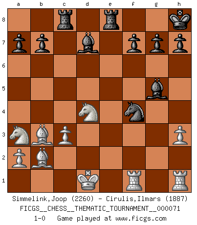 Last move : 1-0 2009 March 1 14:16:5 [Event "FICGS__CHESS__THEMATIC_TOURNAMENT__000071"] [Site "FICGS"] [Date "2009.01.15"] [Round "1"] [White "Simmelink,Joop"] [Black "Cirulis,Ilmars"] [Result "1-0"] [WhiteElo "2260"] [BlackElo "1887"] 1.e4 e5 2.d4 exd4 3.f4 Bb4+ 4.Nd2 Nf6 5.Bd3 d5 6.e5 Ng4 7.Ngf3 O-O 8.Nxd4 c5 9.c3 Ba5 10.Nc2 Nc6 11.Nf3 c4 12.Be2 Bb6 13.Nfd4 Qh4+ 14.g3 Qh3 15.Bf1 Qh6 16.h3 Qg6 17.Qe2 Ngxe5 18.fxe5 Qxg3+ 19.Kd1 Re8 20.Qh2 Qxe5 21.Qxe5 Nxe5 22.b3 Bd7 23.Kd2 Ng6 24.bxc4 dxc4 25.Bxc4 Rac8 26.Bd5 Ba5 27.Bb2 Bd8 28.Raf1 Bg5+ 29.Kd1 Nf4 30.Bb3 Kh8 31.Na3 1-0 Halasz gambit Kingside Castling by player Black (move 7) Player White won this chess game. Follow this game move after move (download)I still hope to kill Fischer. (Boris Spassky) Immer nach dem besten Zug zu suchen ist ziemlich unpraktisch. (Nigel Short) Buenas posiciones no logran ganar juegos, buenas movidas sí. (Gerald Abrahams) Karpov est une pièce de musée. (Garry Kasparov) Luck is when opportunity knocks and you answer. (Anonymous)