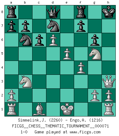 Last move : 1-0 2009 February 27 16:54:3 [Event "FICGS__CHESS__THEMATIC_TOURNAMENT__000071"] [Site "FICGS"] [Date "2009.01.15"] [Round "1"] [White "Simmelink,Joop"] [Black "Engo,Arne Sigvald"] [Result "1-0"] [WhiteElo "2260"] [BlackElo "1216"] 1.e4 e5 2.d4 exd4 3.f4 Nf6 4.e5 Nd5 5.Qxd4 Nb4 6.Qe4 c6 7.Nf3 Qa5 8.c3 Nd5 9.Nbd2 Bc5 10.b4 Qc7 11.bxc5 Nxc3 12.Qf5 d5 13.cxd6 Qd8 14.Qc2 Nd5 15.Bc4 O-O 16.Nb3 Nb6 17.Bd3 Be6 18.Bxh7+ Kh8 19.Ng5 N8d7 20.Bf5 Bxf5 21.Qxf5 g6 22.Qh3+ 1-0 Halasz gambit Kingside Castling by player Black (move 15) Player White won this chess game. Follow this game move after move (download)All I want to do, ever, is just play Chess. (Bobby Fischer) Weshalb minderdergeübte Spieler mit g2-g4 beginnen? Die betreffenden sind unschlüssig, ob sie nun rechts (h4) oder links (f4) beginnen sollen, und in ihrer Ratlosigkeit entschliessen sie sich nach guter Bürgerart dazu, den goldenen Mittelweg zu wählen. (Aaron Nimzowitsch) Desconfianza es la característica mas necesaria de un jugador de Ajedrez. (Siegbert Tarrasch) L'action d'une oeuvre littéraire se déroule sur un champ de bataille. Les masques et les types du drame moderne correspondent aux pièces du jeu d'échecs. L'intrigue correspond aux coups et aux gambits, c'est à dire aux techniques du jeu telles qu'utilisées et interprétées par les joueurs. Les tactiques et les péripéties [mouvements] correspondent aux coups exécutés par l'adversaire. (Viktor Shklovsky) The hypothalamus is one of the most important parts of the brain, involved in many kinds of motivation, among other functions. The hypothalamus controls the 'Four Fs: Fighting, Fleeing, Feeding and Mating. (Unknown author)