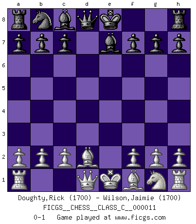 Last move : 0-1 2006 October 15 18:22:8 [Event "FICGS__CHESS__CLASS_C__000011"] [Site "FICGS"] [Date "2006.08.24"] [Round "1"] [White "Doughty,Rick"] [Black "Wilson,Jaimie"] [Result "0-1"] [WhiteElo "1700"] [BlackElo "1700"] 1.e4 Nf6 2.Nc3 d5 3.e5 d4 4.exf6 dxc3 5.fxe7 cxd2+ 6.Bxd2 Bxe7 0-1 This chess game has been lost on time (started : 2006.08.24 14:7:2) Alekhine's defense : Scandinavian variation Player Black won this chess game. Follow this game move after move (download)In Fischer's hands, a slight theoretical advantage is as good a being a Queen ahead. (Isaac Kashdan) Der Umstand, daß uns eine 7 Stunden Zeitkontrolle ermöglicht eine großartige, tiefe Partie zu spielen, ist für die Massenmedien nicht weiter von Bedeutung. (Alexej Shirov) El Ajedrez es tan inspirador que yo no creo que un buen jugador sea capaz de tener un pensamiento malo durante una partida. (Wilhelm Steinitz) Le temps de noter son nom sur la feuille de partie, j'étais déjà en zeitnot ! D'un modeste amateur apparié lors de la première ronde d'un open contre le grand-maître Azmaïparashvili. Don't anthropomorphize computers - they hate it. (Anonymous)