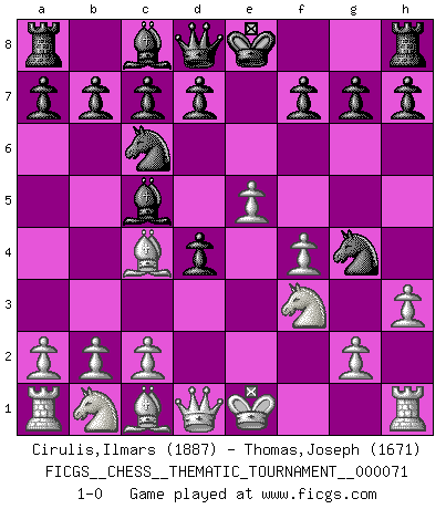 Last move : 1-0 2009 February 27 21:52:17 [Event "FICGS__CHESS__THEMATIC_TOURNAMENT__000071"] [Site "FICGS"] [Date "2009.01.15"] [Round "1"] [White "Cirulis,Ilmars"] [Black "Thomas,Joseph"] [Result "1-0"] [WhiteElo "1887"] [BlackElo "1671"] 1.e4 e5 2.d4 exd4 3.f4 Nc6 4.Nf3 Bc5 5.Bc4 Nf6 6.e5 Ng4 7.h3 1-0 This chess game has been lost on time (started : 2009.01.15 13:20:23) Halasz gambit Player White won this chess game. Follow this game move after move (download)There just isn't enough televised Chess. (David Letterman) Der 70jährige Viktor Kortschnoi: Die Rentenanstalt wollte mich zwingen in Rente zu gehen. Meine Frau erhält jetzt eine Pension- und ich zahle weiter in die Rentenkasse ein! (Viktor Kortschnoi) No volvere nunca a jugar contigo. Has insultado a mi amigo. - cuando un oponente se maldijo por una mala jugada (Miguel Najdorf) Demandez au pauvre Cg1 ce qu'il en pense. Eduard Gufeld à propos de la variante Saemisch de l'Est-Indienne. Life is verb, not a noun. (Charlotte Perkins Gilman)