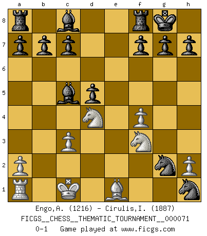 Last move : 0-1 2009 March 12 15:7:10 [Event "FICGS__CHESS__THEMATIC_TOURNAMENT__000071"] [Site "FICGS"] [Date "2009.01.15"] [Round "1"] [White "Engo,Arne Sigvald"] [Black "Cirulis,Ilmars"] [Result "0-1"] [WhiteElo "1216"] [BlackElo "1887"] 1.e4 e5 2.d4 exd4 3.f4 Bb4+ 4.Bd2 Qe7 5.Qf3 Nf6 6.e5 d5 7.Bd3 Nc6 8.c3 dxc3 9.bxc3 Bc5 10.Ne2 Ng4 11.Nd4 Ncxe5 12.Qg3 Nxd3+ 13.Kd1 Ndf2+ 14.Kc1 Nxh1 15.Qe1 Qxe1+ 16.Bxe1 O-O 17.Nd2 Ne3 18.N2f3 Nxg2 0-1 Halasz gambit Kingside Castling by player Black (move 16) Player Black won this chess game. Follow this game move after move (download)Best by test: 1. e4 (Bobby Fischer) Strategie ist, wie man ein Mädchen auf den Rücksitz bekommt. Taktik ist, was man tut, wenn man dann dort ist. (Anonymous) Una buena memoria, concentración, imaginación y una fuerte voluntad, se requiere para llegar a ser un buen jugador. (Bobby Fischer) Les ravages du H expliquent la différence de niveau entre Tal et Thal [Abergel]. The problem with manipulation is that people can turn on you. (Horatio Caine, C.S.I. Miami)