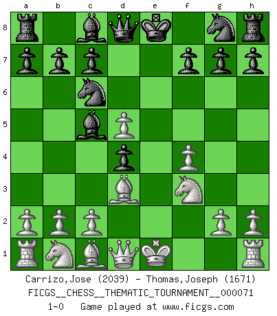 Last move : 1-0 2009 March 1 21:55:38 [Event "FICGS__CHESS__THEMATIC_TOURNAMENT__000071"] [Site "FICGS"] [Date "2009.01.15"] [Round "1"] [White "Carrizo,Jose"] [Black "Thomas,Joseph"] [Result "1-0"] [WhiteElo "2039"] [BlackElo "1671"] 1.e4 e5 2.d4 exd4 3.f4 Nc6 4.Nf3 Bc5 5.Bd3 d5 6.exd5 1-0 This chess game has been lost on time (started : 2009.01.15 13:20:23) Halasz gambit Player White won this chess game. Follow this game move after move (download)Chess is a sea in which a gnat may drink and an elephant may bathe. (Hindu proverb) Lisa Lane, amerikanische Schachmeisterin, hatte Fischer einmal als stärksten lebenden Spieler bezeichnet. Antwort: Das ist richtig, aber Lisa Lane ist eigentlich nicht in der Lage, das zu beurteilen. (Robert James Fischer) El Ajedrez es un terrible juego. Si no controlas el centro, tu oponente tiene una posición mas holgada. Si tienes control del centro, ¡entonces realmente tu tienes algo de que preocuparte!. (Siegbert Tarrasch) L'ordinateur a tué l'originalité. Il n'y a plus guère d'aventures sur l'échiquier. (Jacob Murray) The quality of decision is like the well-timed swoop of a falcon which enables it to strike and destroy its victim. (Sun Tzu)