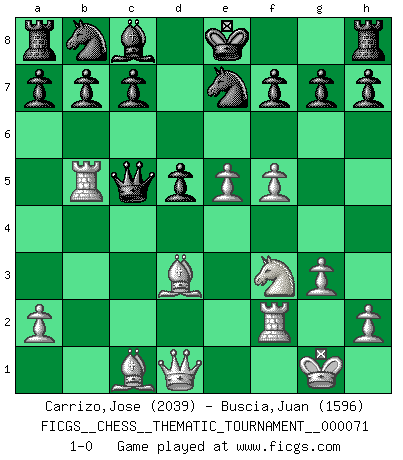 Last move : 1-0 2009 April 28 4:19:43 [Event "FICGS__CHESS__THEMATIC_TOURNAMENT__000071"] [Site "FICGS"] [Date "2009.01.15"] [Round "1"] [White "Carrizo,Jose"] [Black "Buscia,Juan"] [Result "1-0"] [WhiteElo "2039"] [BlackElo "1596"] 1.e4 e5 2.d4 exd4 3.f4 Qh4+ 4.g3 Bb4+ 5.c3 dxc3 6.bxc3 Qf6 7.e5 Qg6 8.Nf3 Ba5 9.Bd3 Qc6 10.O-O Bxc3 11.Nxc3 Qxc3 12.Rb1 Qc5+ 13.Rf2 d5 14.f5 Ne7 15.Rb5 1-0 This chess game has been lost on time (started : 2009.01.15 13:20:23) Halasz gambit Kingside Castling by player White (move 10) Player White won this chess game. Follow this game move after move (download)It is always better to sacrifice your opponent's men. (Savielly Tartakower) Ich moechte nie einem Club beitreten, der Leute wie mich als Mitglieder aufnimmt. (Woody Allen) Nada excita más a Grandes Maestros aburridos que una novedad teórica. (Dominic Lawson) Vous savez, camarade Pachman, je n'éprouve pas de plaisir à être ministre, je jouerais plutôt aux échecs comme vous, ou alors ferais une révolution au Venezuela. (Che Guevara à Ludek Pachman, 'Checkmate in Prague', 1975) We're missing something. (Gregory House, House M.D.)