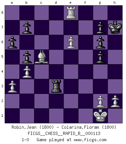 Last move : 1-0 2009 February 7 15:10:39 [Event "FICGS__CHESS__RAPID_B__000113"] [Site "FICGS"] [Date "2009.01.15"] [Round "1"] [White "Robin,Jean"] [Black "Colarina,Floram"] [Result "1-0"] [WhiteElo "1800"] [BlackElo "1800"] 1.e4 e5 2.Nf3 Nc6 3.Bb5 Bc5 4.c3 d6 5.d4 exd4 6.cxd4 Bb4+ 7.Nc3 Bd7 8.O-O a6 9.Bd3 h6 10.Nd5 Ba5 11.a3 Nge7 12.b4 Bb6 13.Nxb6 cxb6 14.d5 Ne5 15.Nxe5 dxe5 16.f4 exf4 17.Bxf4 O-O 18.Qh5 Ng6 19.Bg3 b5 20.e5 Be8 21.e6 Qg5 22.Qxg5 hxg5 23.Bxg6 fxg6 24.Rxf8+ Kxf8 25.Bd6+ Kg8 26.Rf1 Rd8 27.Rf8+ Kh7 28.Be7 Rxd5 29.Rxe8 Rd3 30.Bc5 1-0 Ruy Lopez : Classical defense, 4.c3 Kingside Castling by player White (move 8) Kingside Castling by player Black (move 17) Player White won this chess game. Follow this game move after move (download)It began to feel as though you were playing against Chess itself. - On playing against Robert Fischer. (Walter Shipman) Es tut gut, die Entwicklungsperiode von, [...] demokratischem Geist durchdringen zu lassen. Wie undemokratisch wäre es doch beispielsweise, den einen Offizier große Spaziertouren vornehmen zu lassen, während die anderen zu Hause säßen und sich entsetzlich langweilten. (Aaron Nimzowitsch) Si tu oponente te ofrece un empate, trata de averiguar porque piensa él que esta en una posición peor. (Nigel Short) Vous m'avez demandé de vous exposer quel est le fondement de la prière. Je ne fais que préparer les pièces du jeu sur la table... Nous sera-t-il permis d'en adopter les règles et si nous les appliquons scrupuleusement nous ne tarderons pas à faire mat le Roi divin ! Il ne pourra échapper à nos mains. (Sainte Thérèse d'Avila, Chemin de perfection) Begin at the beginning and go on till you come to the end; then stop. (Lewis Carrol, Alice in Wonderland)