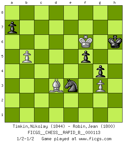 Last move : 1/2-1/2 2009 April 13 12:3:55 [Event "FICGS__CHESS__RAPID_B__000113"] [Site "FICGS"] [Date "2009.01.15"] [Round "1"] [White "Timkin,Nikolay"] [Black "Robin,Jean"] [Result "1/2-1/2"] [WhiteElo "1844"] [BlackElo "1800"] 1.e4 d6 2.d4 Nf6 3.Nc3 g6 4.Nf3 Bg7 5.Be2 O-O 6.O-O c6 7.Re1 Nbd7 8.Bf4 b5 9.e5 Ne8 10.a3 dxe5 11.dxe5 Nc7 12.Nd4 Nxe5 13.Bxe5 Bxe5 14.Nxc6 Qxd1 15.Nxe7+ Kg7 16.Nxd1 Re8 17.Nxc8 Raxc8 18.c3 Bf4 19.Ne3 Bxe3 20.fxe3 Rxe3 21.Kf2 Rce8 22.Rac1 R8e5 23.g3 Kf6 24.c4 bxc4 25.Bxc4 Rxe1 26.Rxe1 Rxe1 27.Kxe1 Ne8 28.Kd2 Nd6 29.Bd3 Ke5 30.Ke3 f5 31.b4 Kd5 32.Be2 Nc4+ 33.Kf4 Nxa3 34.Kg5 Nc2 35.Kh6 Ke5 36.b5 Kf6 37.h4 Ne3 38.Kxh7 g5 39.h5 g4 40.Kg8 Kg5 41.Kg7 Kxh5 42.Kf6 Kh6 43.Bd3 1/2-1/2 Pirc : Classical system, 5.Be2 Kingside Castling by player Black (move 5) Kingside Castling by player White (move 6) 10 pieces endgame at move 38 : White KBPPP , Black KNPPP WHITE : King + 1 Bishop 3 Pawns BLACK : King + 1 Knight 3 Pawns 9 pieces endgame at move 41 : White KBPP , Black KNPPP WHITE : King + 1 Bishop 2 Pawns BLACK : King + 1 Knight 3 Pawns This chess game ended in a draw. Follow this game move after move (download)If a ruler does not understand Chess, how can he rule over a kingdom ? (King Khusros II) Mein Name ist Rustam Kamsky. Sie haben meinen Sohn belästigt. Bereiten Sie sich aufs Sterben vor. (Rustam Kamsky) Realmente no sabemos como el juego fue inventado, aunque hay sospechas. Tan pronto como descubramos a los culpables, se los haremos saber. (Bruce Pandolfini) Aux échecs, les retours au sommet sont rares : les dommages psychologiques consécutifs à une défaite sont trop sévères. (Daily Telegraph) Every man's memory is his private literature. (Aldous Huxley)