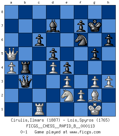 Last move : 0-1 2009 March 1 14:49:57 [Event "FICGS__CHESS__RAPID_B__000113"] [Site "FICGS"] [Date "2009.01.15"] [Round "1"] [White "Cirulis,Ilmars"] [Black "Lois,Spyros"] [Result "0-1"] [WhiteElo "1887"] [BlackElo "1765"] 1.d4 Nf6 2.c4 e6 3.g3 d5 4.Bg2 Nbd7 5.Nf3 c6 6.Qc2 Bb4+ 7.Bd2 Bd6 8.O-O O-O 9.b3 e5 10.Nc3 Re8 11.cxd5 cxd5 12.Nb5 Bb8 13.Rfc1 e4 14.Ng5 h6 15.Nh3 Nf8 16.e3 Ne6 17.Nf4 Bd7 18.Nxe6 Rxe6 19.Nc3 a5 20.Qb2 Bd6 21.Rc2 Be7 22.a4 Rc6 23.Rac1 Qc8 24.Ne2 Ba3 25.Rxc6 Qf8 26.Qc2 bxc6 27.Rb1 Qb8 28.Nf4 Bd6 29.Be1 g6 30.h3 Kg7 31.Rb2 g5 32.Ne2 Qb6 33.Rb1 Rb8 34.Bc3 Qa6 35.Rc1 Bc7 36.Qb2 Qb7 37.Qd2 Qxb3 38.Bxa5 Bxa5 39.Qxa5 Rb4 0-1 Catalan : Closed Kingside Castling by player White (move 8) Kingside Castling by player Black (move 8) Player Black won this chess game. Follow this game move after move (download)Botvinnik tried to take the mystery out of Chess, always relating it to situations in ordinary life. He used to call Chess a typical inexact problem similar to those which people are always having to solve in everyday life. (Garry Kasparov) Wenn Du absolut nicht mehr weißt, was Du tun sollst, dann ist es Zeit für Panik. (John van der Wiel) Diferente gente reacciona diferentemente en aceptar la derrota. (Bobby Fischer) La vie et les Echecs sont tous les deux une lutte constante. (Lasker) Good luck. You're gonna need it. (Han Solo in Star Wars ep.6)