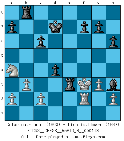 Last move : 0-1 2009 February 28 16:13:6 [Event "FICGS__CHESS__RAPID_B__000113"] [Site "FICGS"] [Date "2009.01.15"] [Round "1"] [White "Colarina,Floram"] [Black "Cirulis,Ilmars"] [Result "0-1"] [WhiteElo "1800"] [BlackElo "1887"] 1.e4 c5 2.Nf3 Nc6 3.d4 cxd4 4.Nxd4 e5 5.Nxc6 bxc6 6.Be2 Nf6 7.Bg5 h6 8.Bh4 Rb8 9.Bxf6 Qxf6 10.b3 Qg6 11.g3 Qxe4 12.O-O d5 13.Re1 Qf5 14.Bg4 Qxg4 15.Qxg4 Bxg4 16.Rxe5+ Kd7 17.Nc3 Bc5 18.Kg2 Bd4 19.Re3 Bxe3 20.fxe3 Rhe8 21.Re1 d4 22.Na4 Rxe3 23.Rf1 Re2+ 24.Rf2 Bh3+ 25.Kf3 Re3+ 0-1 Sicilian : Labourdonnais-Loewenthal variation Kingside Castling by player White (move 12) Player Black won this chess game. Follow this game move after move (download)Strategy requires thought, tactics require observation. (Max Euwe) Immer nach dem besten Zug zu suchen ist ziemlich unpraktisch. (Nigel Short) El Ajedrez, como cualquier actividad creativa, solo puede existir a través del esfuerzo combinado de aquellos que tienen talento creativo y de aquellos que poseen la habilidad de organizar su trabajo creativo. (Mikhail Botvinnik) Le profane ne songe pas à la somme de jouissance dont il se prive, qui méconnaît ce jeu aux ressources aussi variées que passionnantes. (Jean-Marie Jeanton-Lamarche) The ego is not master in its own house. (Sigmund Freud)